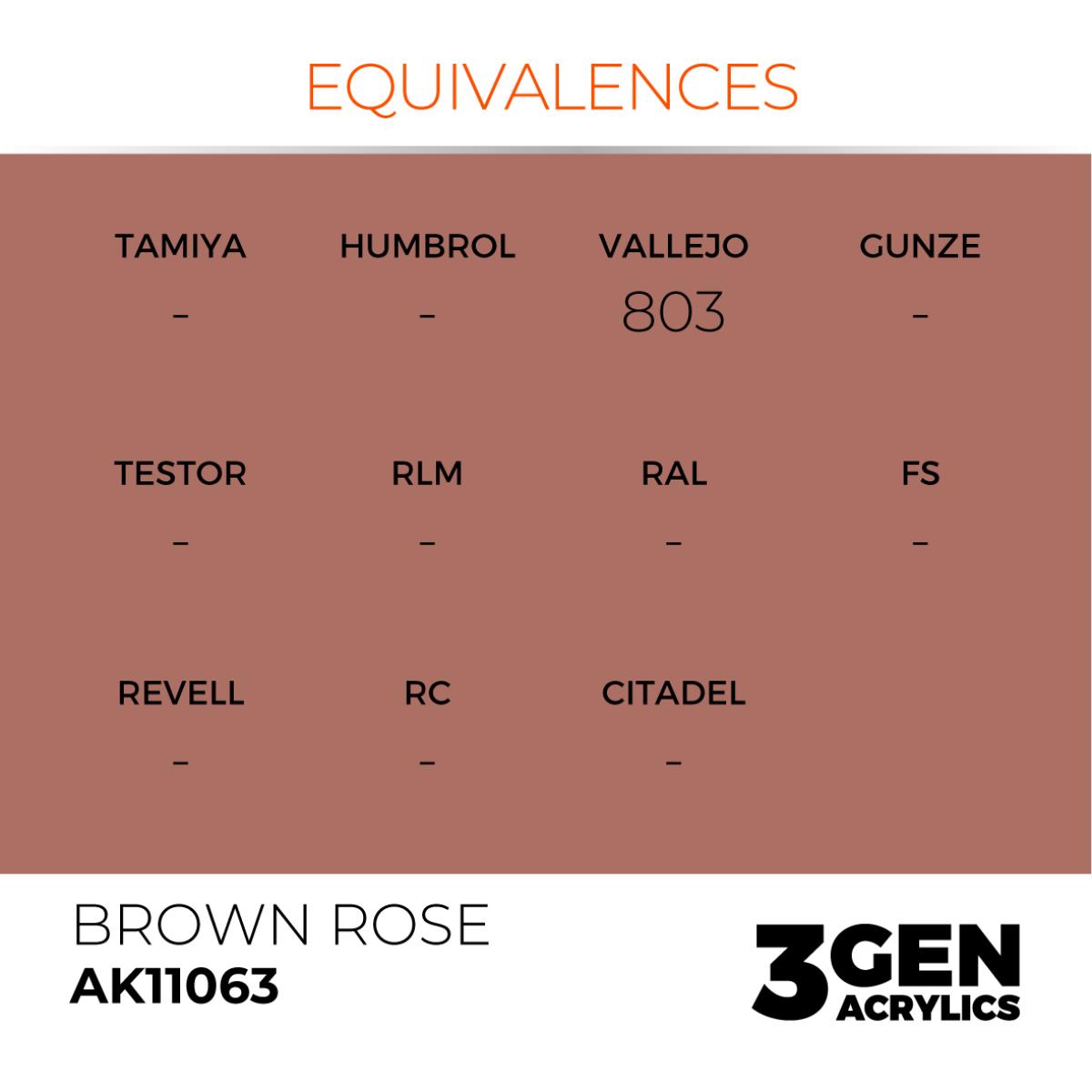 AK 11063 17 ml. Brown Rose, 3GEN Akrilik Model Boyası, hobi amaçlı modellere ideal bir seçim. Bu boyanın akrilik yapısı ve 17 ml'lik hacmi, modelcilere büyük özgürlük sunar. Brown Rose rengi, modellere tarihi ve kültürel karakter verir. Ayrıca bu ürün, modellere gerçekçiliği artırmak için kullanılan AK INTERACTIVE markasının garantisi altındadır.