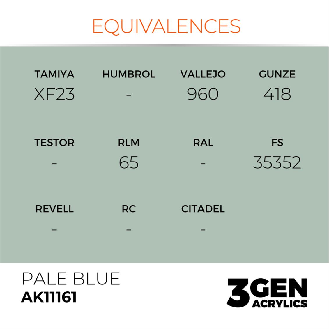 AK 11161 17 ml. Pale Blue, 3GEN Akrilik Model Boyası, modellere ideal bir boyadır. Uzmanlar tarafından geliştirilmiş olan bu boyalar, gerçekçi resimlere ve detaylara sahiptir. Modellere renk ve derinlik katan bu boyalar, hobi amaçlı kullanım için uygundur.