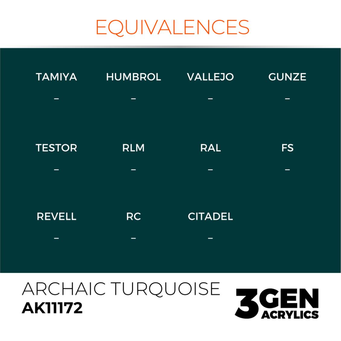 AK 11172 Archaic Turquoise, 3GEN Akrilik Model Boyası, hobi amaçlı modellere mükemmel bir seçim. Bu boyaya sahip modelleriniz için olağanüstü detaylar ve realistik renkler sunar. Modelcilerin en sevdiği boyalar arasındadır.