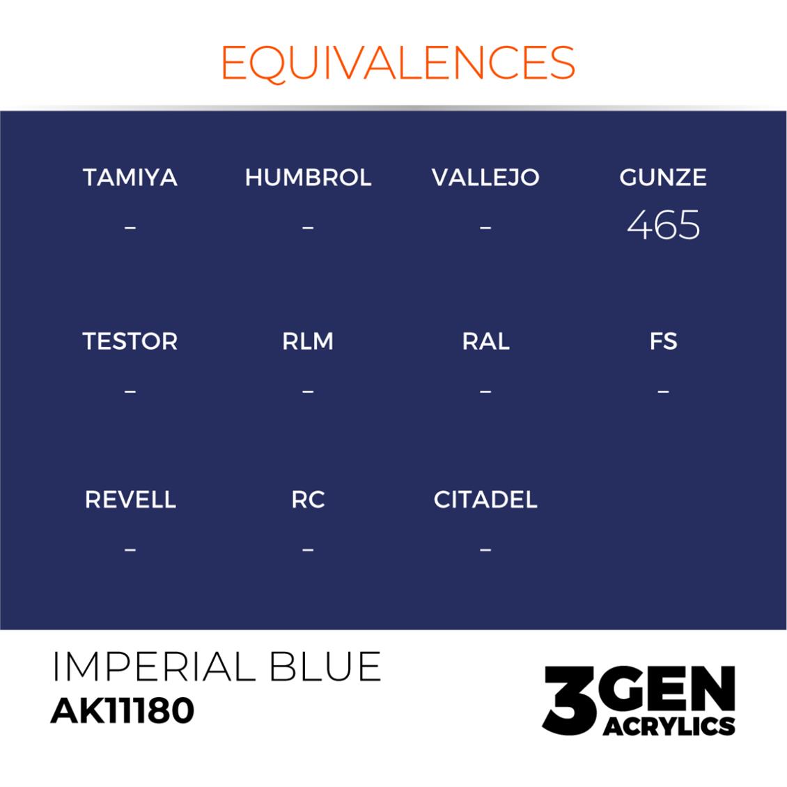 AK 11180 17 ml. Imperial Blue, 3GEN Akrilik Model Boyası, hobi amaçlı modelcilikte kullanabileceğiniz ideal bir ürün. Bu boyanın düşük tüketim oranı ve su geçirmez yapısı, modellere karşı hassasiyetini azaltıyor. İmparator Mavi renkli bu boyayı, hobi amaçlı modelinizi renklendirmek ve detaylandırarak oluşturmak için kullanılabilmektedir.