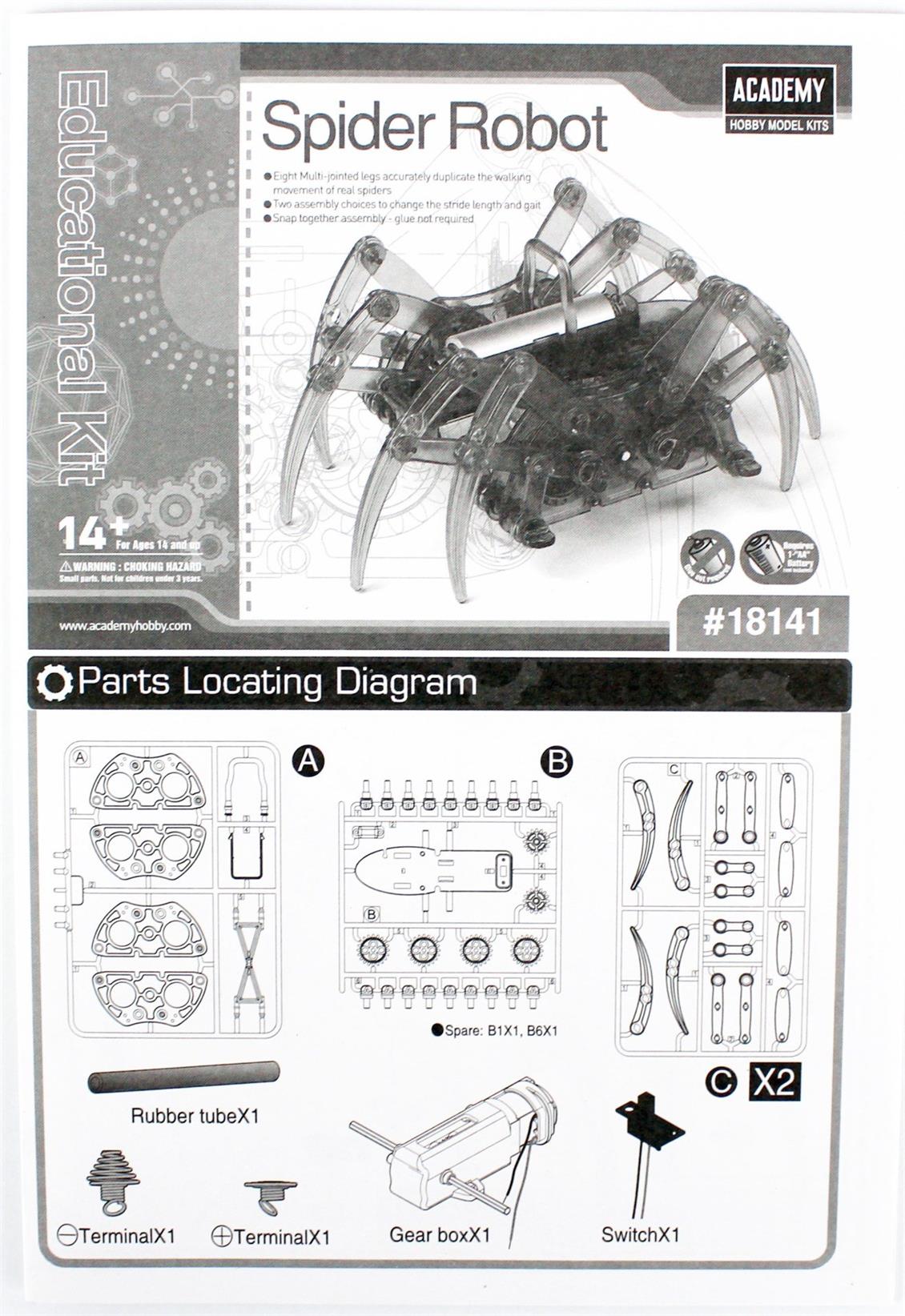 Acht multi -artikulierte Beine kopiert die Wanderbewegung echter Spinnen. Zwei Montageoptionen, um den Schritt und die Länge des Spaziergangs zu ändern. Pass -Baugruppe - Klebstoff ist nicht erforderlich.Der Spinnenroboter arbeitet mit einer einzelnen "AA" -Katterie, und vorab verdrahtete Motoren und Zahnräder sitzen an Ort und Stelle, indem sie dem Modell Stärke verleiht. Acht Multi -Jint -Füße, die aus hochwertigen technischen Kunststoffen hergestellt wurden, kopiert die Wanderbewegung echter Spinnen genau. Es gibt zwei Montageoptionen, um den Schritt und die Tür der "Spinne" zu ändern. Die Verwendung des Spinnenroboters, Elektrizität, mechanische, Physik-, Entomologie- und Bewegungsprinzipien können gesehen und gelehrt werden. Das Beste von allen kommt in kurzer Zeit zusammen und "cool" als Anzeige- oder Tabellenmodell.