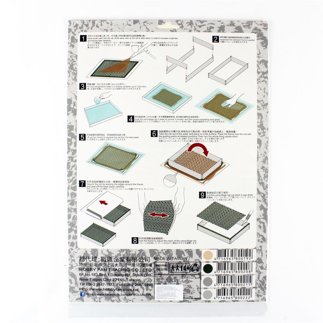 Militärtarme Tarnung ist eine Tarnung, die von den Streitkräften verwendet wird, um das Personal und die Ausrüstung vor der Beobachtung feindlicher Streitkräfte zu schützen. Es ist die Art von militärischer Täuschung und wird häufig in militärischen Taktiken eingesetzt. Praktisch; Alle Arten von Militärausrüstung, einschließlich Fahrzeugen, Schiffen, Flugzeugen, Waffenpositionen und Kriegsuniformen, sind Farben und Materialien. Die Stealth -Technologie wurde geschaffen, um Luftkämpfe, Schiffe, U -Boote, Raketen, Satelliten und die Armee für den Feind weniger sichtbar zu machen.Es handelt sich um ein Tarn -Netzwerk, das in allen Kriegsgebieten verwendet werden kann. Es wird besonders in Positionsbautechnik und Tanks verwendet. Mit 4 verschiedenen Optionen können Sie mit AFV Club getarnte Netzwerke Ihre Panzer und Truppen tarnen.