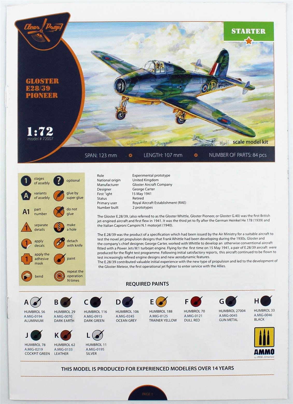 Clear Prop-Modelle 72007 1/72 Skala, Gloster E28-39 Pioneer Offensivjet, Kunststoffmodell-Kiti