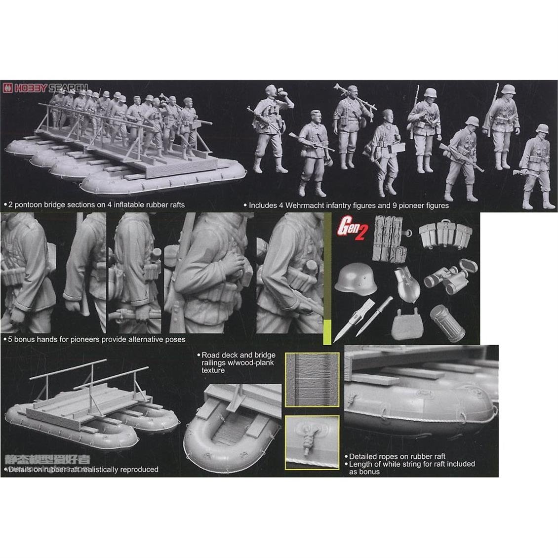 Flüsse bilden natürliche Verteidigungslinien und die erste Aufgabe eines Verteidigers besteht darin, die strategischen Brücken zu zerstören. Dies fand während des Fortschritts deutscher Truppen in ganz Europa zu Beginn des Zweiten Weltkriegs statt. Obwohl Deutschlands Blitzkrieg oft so schnell bewegte, wurden die Verteidiger besiegt, bevor sie die Gelegenheit hatten, die Brücken zu zerstören, und andere wurden erfolgreich in die Luft gesprengt. Dies ist der Ort, an dem Kriegsingenieure, Pioniere in Deutschland, ins Spiel kommen. Sie waren mit verschiedenen Geräten ausgestattet, um Brücken auf den Wasserstraßen zu bauen. Genannte Brücken waren eine der schnellsten Mittel. Das neue Set von Dragon's New 1/35 enthält ein solches Pontonsystem. Das neue Premium -Versionsartikel ist ein umfassendes Set, das mindestens vier Gummi -Floß und zwei verwandte Brückensysteme umfasst. Wenn sie miteinander verbunden sind, können sie einen kleinen Wasserweg überqueren. Die Flöße sind gut definiert und Seillängen werden dargestellt, um der Bindung Details hinzuzufügen. Brückenstraßen und -geländer wurden ebenfalls mit einem empfindlichen hölzernen gefertigten Gewebe abgeschlossen und genau abgebildet. Um dieses Pontonsystem zu füllen, gibt es insgesamt 13 Soldaten, von denen vier Infanterie und neun Pioniere sind. Einige der letzteren sind auch mit den Händen ausgestattet, die eine nützliche Expositionsänderung ermöglichen. Das umfassende Set ist vielleicht ideal für Modellierer, die eine frühe Kriegsszene in Frankreich oder Russland schaffen möchten. Diese deutschen Soldaten, die alles erobert haben, bewegen sich unerbittlich vorwärts, und selbst die zerstörten Brücken können ihren Blitzfortschritt nicht verlangsamen!