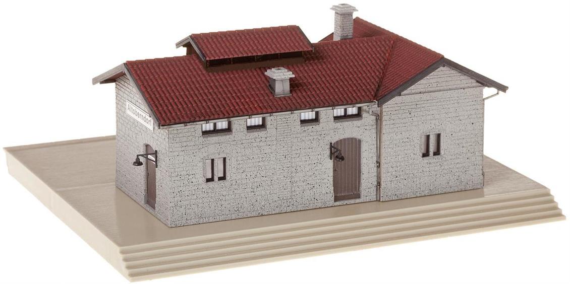 Steinstation in Steinbau mit sierer Dach und Plattform.Das Zug Diorama ist wie das Erreichen des extremsten Punktes des Hobby. Sie benötigen verschiedene Häuser und Modelle, wenn Sie Ihre eigene Traumwelt schaffen. Je größer Ihre Traumwelt, desto schöner werden Sie tun. Wenn Sie die 1930er Jahre auf einer Skala von 1/87 erinnern möchten. Es wäre die richtige Entscheidung, das Modell der Station Trossingen auszuwählen. Das feinste Detail wird zum Modell verarbeitet.