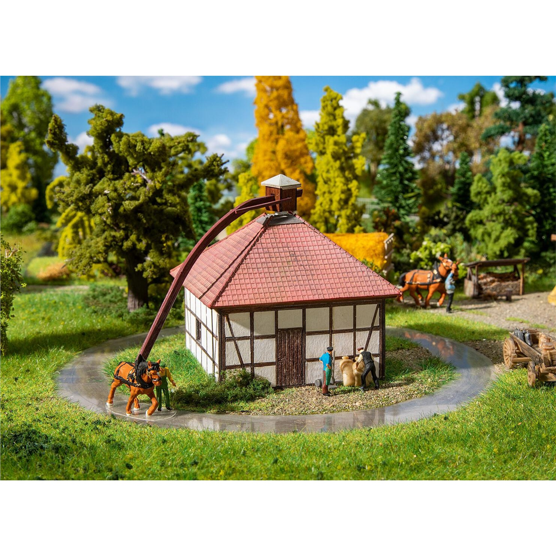 Bewegte Miniaturwelten. Faller 130582 Rahdener Pferdemühle im Maßstab 1:87, Plastikmodellbausatz, historische Pferdemühle aus der Zeit um 1860 mit quadratischem Grundriss, Fachwerkfassade und rundem Ziegeldach nach einem Original im Museumshof in Rahden-Kleinendorf, Nordrhein-Westfalen. Zur Inszenierung liegen Antriebsteile für die Motorisierung des Whim-Systems sowie Müller und Pferd als Miniaturfiguren bei. Verwenden Sie den Synchron-Hobbymotor oder den Getriebemotor, um das Modell anzutreiben. Kein Motor enthalten. Sehen Sie das Originalgebäude unter: www.museumshof-rahden.de