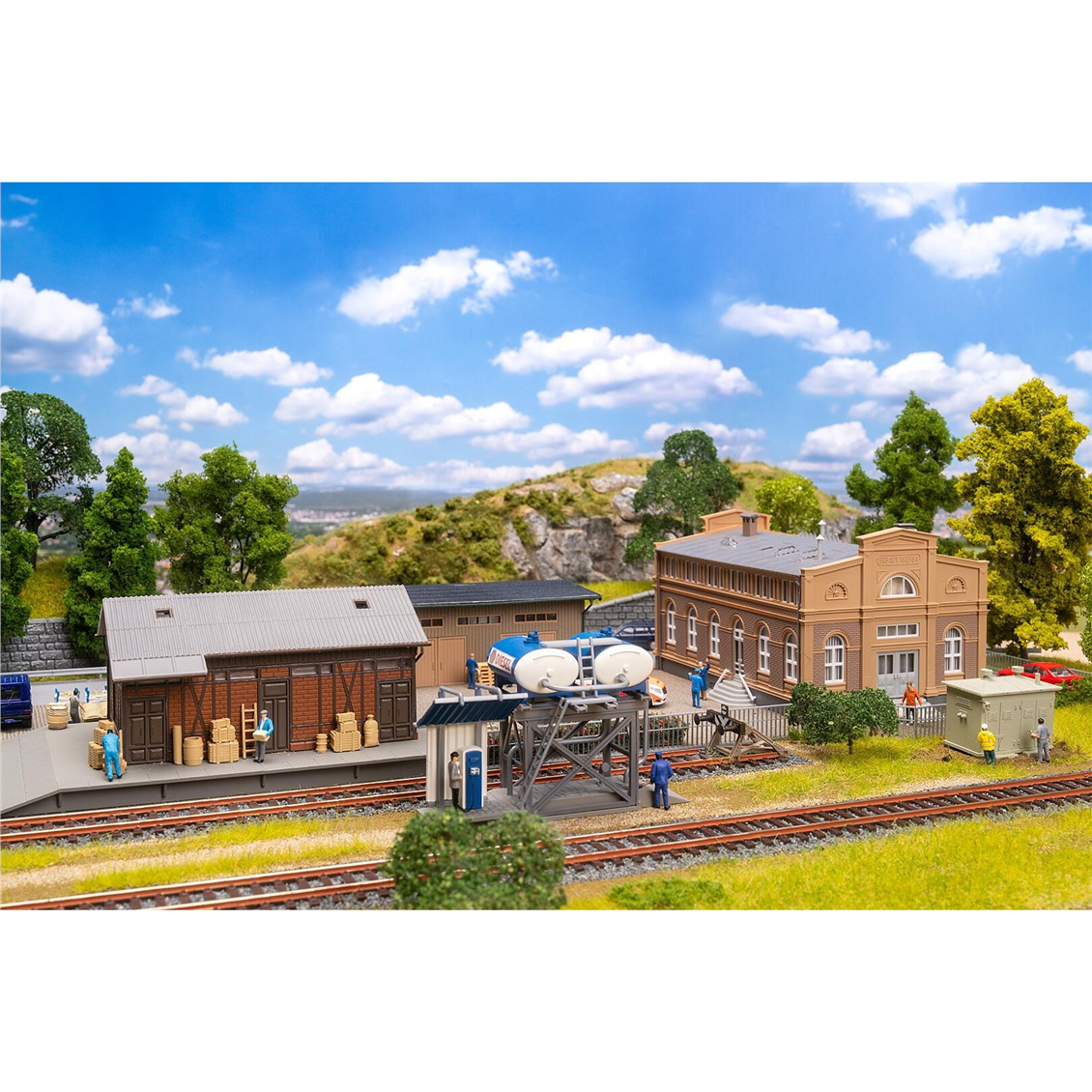 Beschreibung: Dieses Action-Set verwandelt jeden Bahnhof in ein realistisches Warensortierzentrum! Das sandfarbene, aus Backsteinen errichtete Verwaltungsgebäude dient der Organisation der Abläufe, während die Lagerhalle mit roten Backsteinwänden als Zwischenlager für Waren dienen wird. Ein einfaches Lagerhaus aus Holz, ein Transformatorenhaus und eine Dieseltankstelle runden das Bild ab – perfekt für eine atmosphärische Miniaturlogistik.