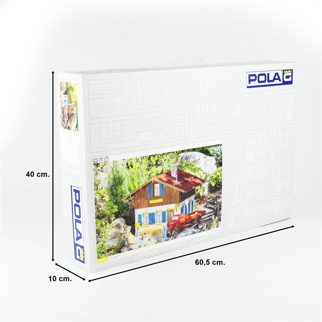 Ländliches Gebäudemodell mit heller Stuckfassade, Holzverkleidung im Dachgeschoss und Balkon auf der Rückseite. Im Erdgeschoss befindet sich eine kleine Postfiliale. Das Modell verfügt über posttypische Dekorationselemente wie Außenbeschilderung, Standbriefkasten, Dienstfahrrad und Bodenplatte. Allerdings ist auch das »Post Office Tool Goli« (Produktcode: 331617) separat erhältlich.