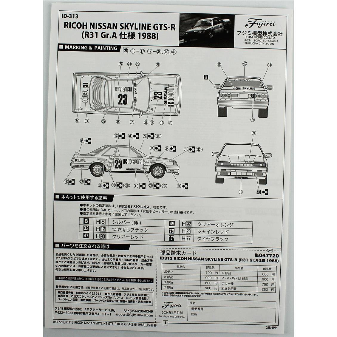 Fujimi ID-313 04772 1/24 Skala Nissan Ricoh Skyline GTS-R (R31 Gr.Aa 1988) Rennwagen-Kunststoff-Modell-Kit ist eine detaillierte Reproduktion von Nissans R31 Gr.A-Rennversion, das 1988 verwendet wurde. Dieses Modell zeigt den Charakter und die Leistung von R31 Skyline, einem der Motorssport des Nissan. Dieses Kit spiegelt das aerodynamische Design, leistungsstarke Motor- und Race -spezifische Details des Fahrzeugs wider und bietet ein einzigartiges Bauerlebnis für Automobilmodel -Enthusiasten. Dieses Modell, das besonders für Sammler, die an Rennwagen interessiert sind, ein unverzichtbares Bestandteil ist, wurde mit jedem Detail auf realistische Weise gebaut. Empfehlungen
