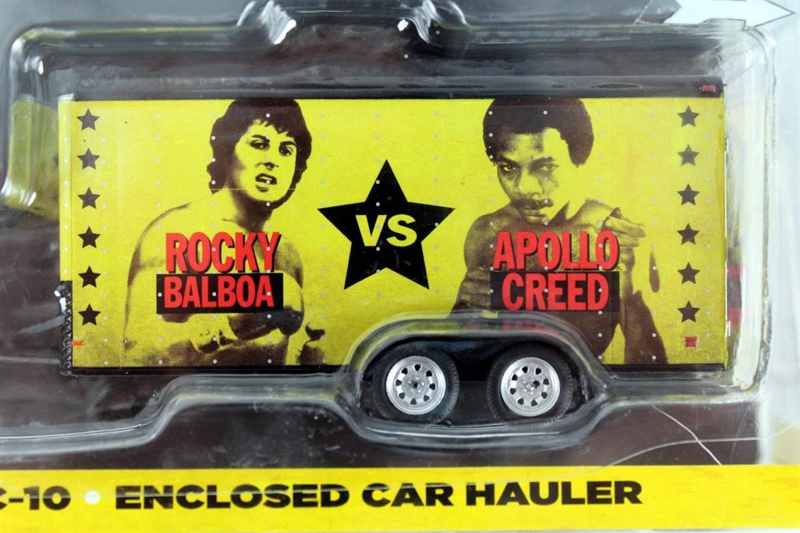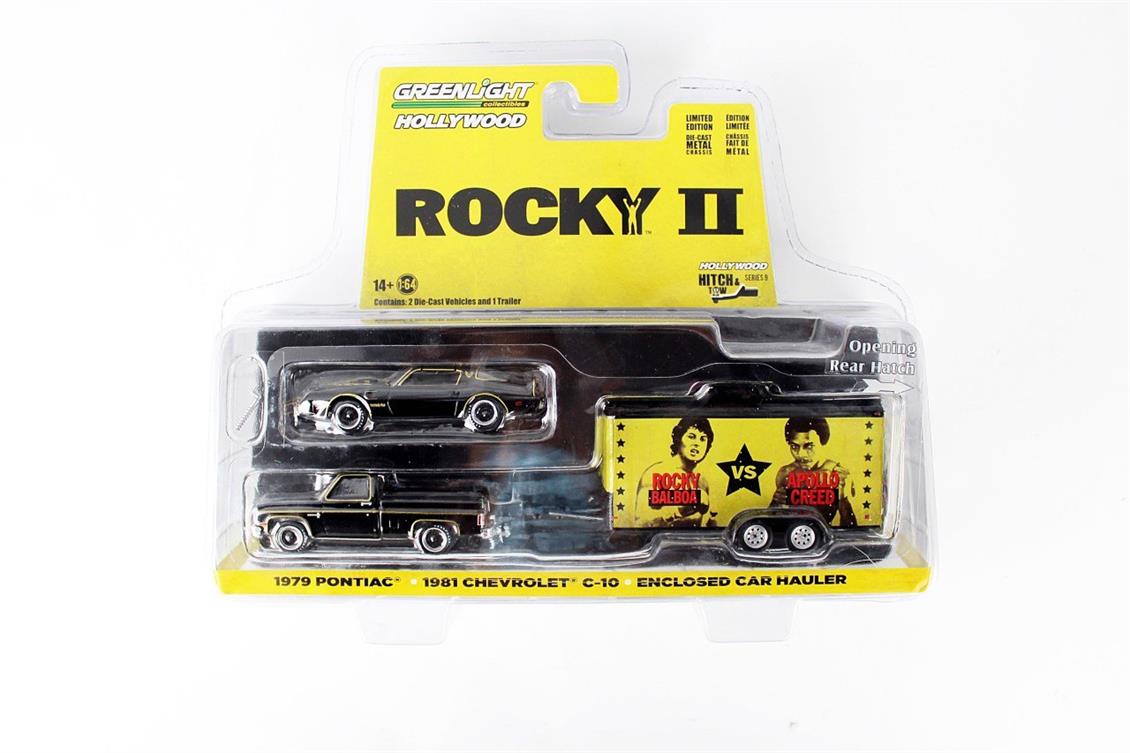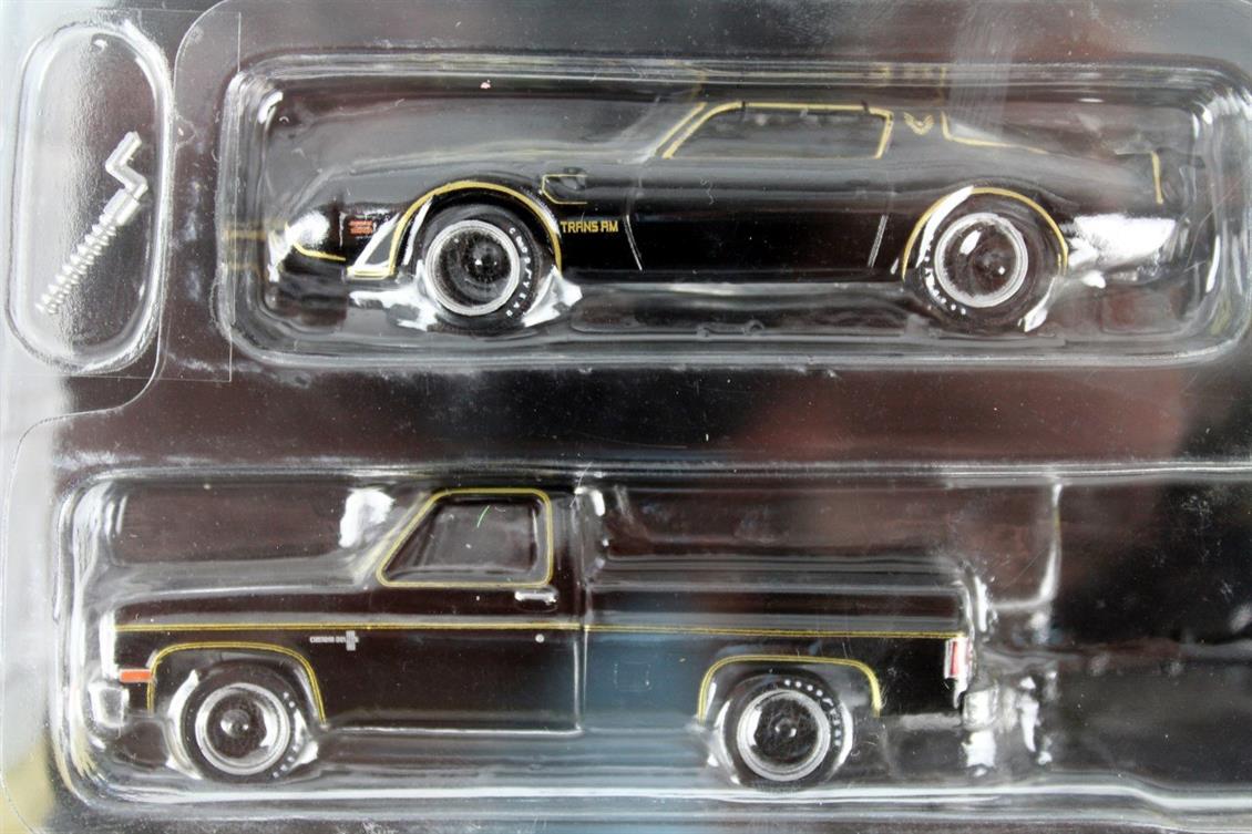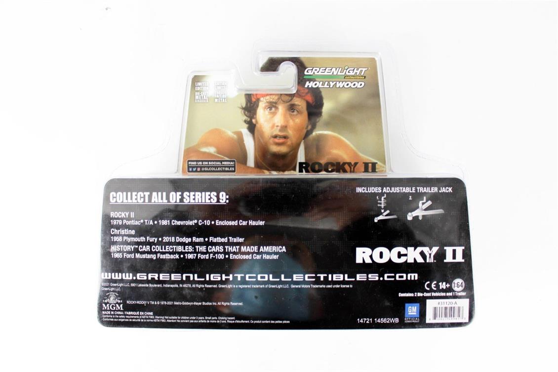 Greenlight 31120a 1/64 1981 Chevrolet C-10 Custom Deluxe mit Rocky's 1979 Pontiac Firebird-Transam, bereit, Metalltransporter und Automodell auszustellen