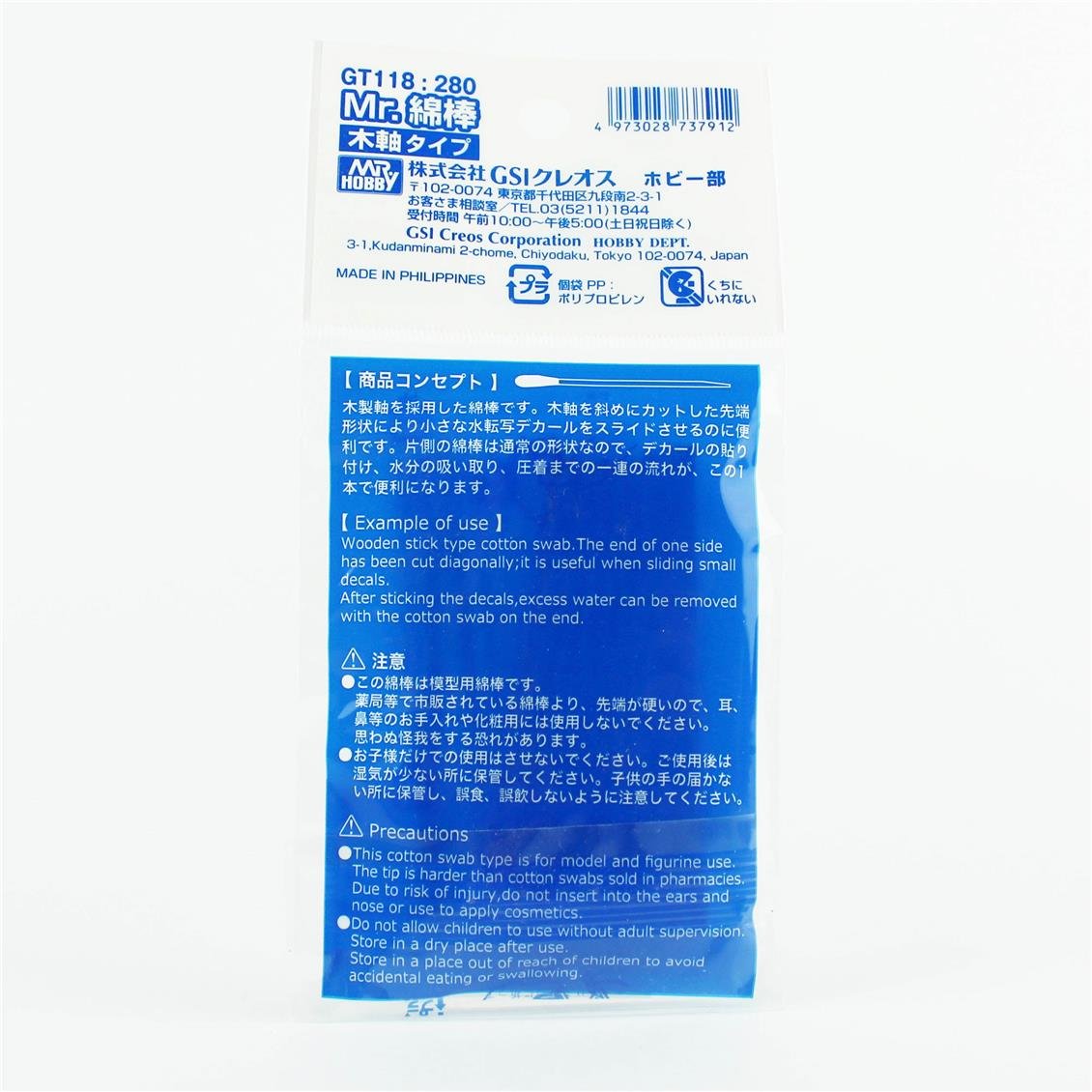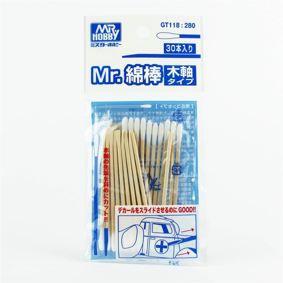 Eine Wattestäbe mit Holzgriff. Das Ende des Holzstiels wird abgewinkelt, so dass kleine Wassertransferaufkleber leicht verschoben werden können. Eine Seite der Baumwollstange ist normal geformt, sodass Sie die Entfernung leicht auftragen, Feuchtigkeit absorbieren und mit einer einzelnen Stange drücken können.
