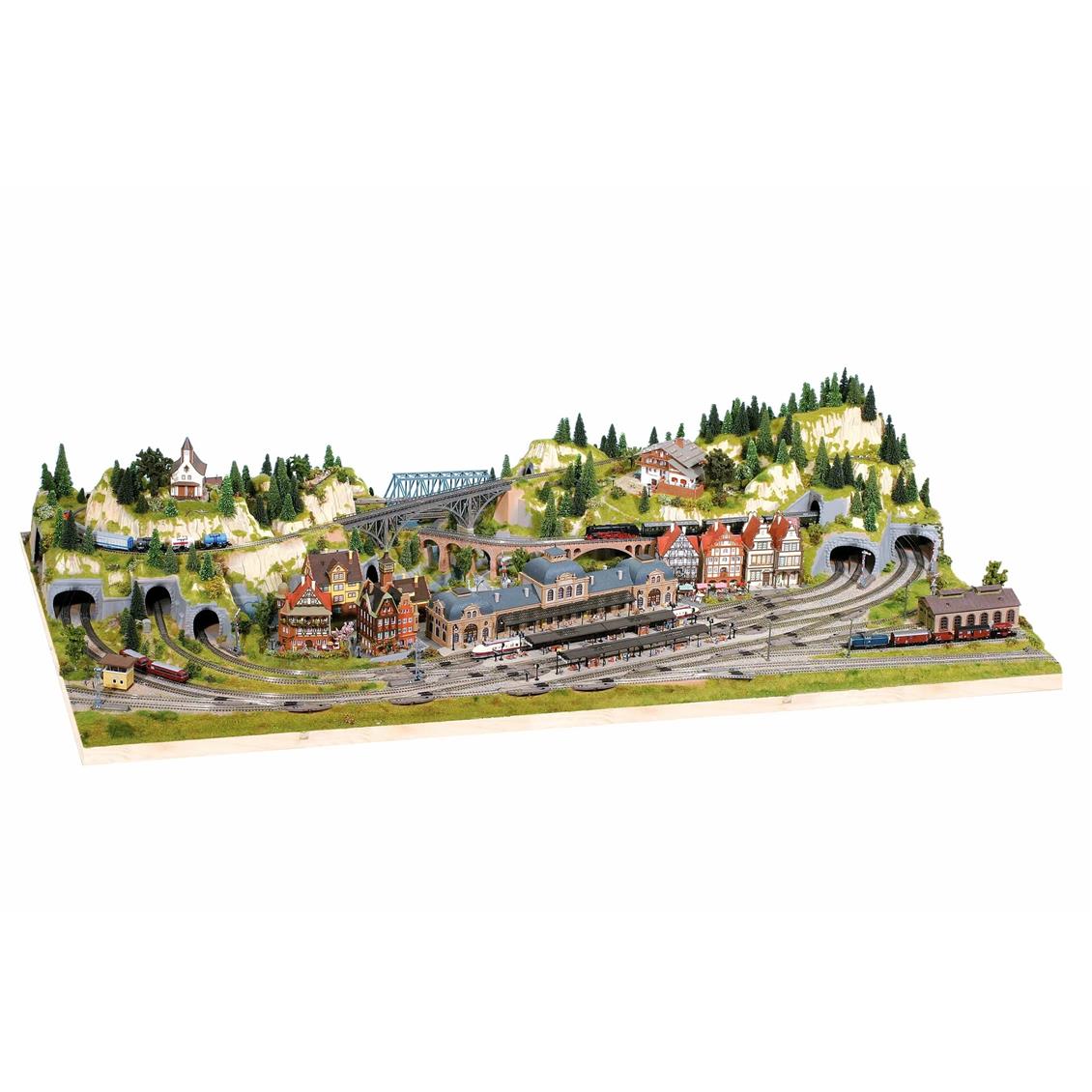 "Baden-Baden" ist ein besonders attraktives, großes Modell mit seinen reichhaltigen Eisenbahnbetrieb und erfüllt die Bedürfnisse selbst der sachkundigsten Modelltrainer in Bezug auf technische Bedürfnisse. Baden-Baden, eine romantische Spa-Stadt, die in der natürlich aussehenden Low Mountain Row erbaut wurde, ist der Hauptzauber des beeindruckenden Bahnhofs mit fünf Übergangslinien und zwei Perones. Es gibt sechs Seitenlinien, die mit der Station und einer Station mit einer Beule verbunden sind. Diese ziemlich breite Route ermöglicht den Betrieb langer Züge. Das bergige Gebiet, das sechs Tunnel, vier Stufe Brücken und einen Zweigstellen verfügt, ermöglicht einen extrem realistischen Zugbetrieb. Diese können zu einer vollständig funktionalen Levelübergang und einem kleinen See mit einem Bach und einem Böschung hinzugefügt werden. N und Z Leitungswidth:Vier Eisenbahnschaltkreis und sieben Seitenleitungen. Wenn das Z gemäß der Breite angeordnet ist, sollte die Bergroute im vorgezogenen Modus von längeren Zügen (zwei Lokomotiven) betrieben werden. Natürlich bieten wir zahlreiche Expansionsoptionen für dieses vorgefertigte Land mit den verschiedenen Stecker von Noch an. Für Ihren idealen Stand für Ihr vorgefertigtes Land empfehlen wir das kompatible Aluminiumrahmensystem.