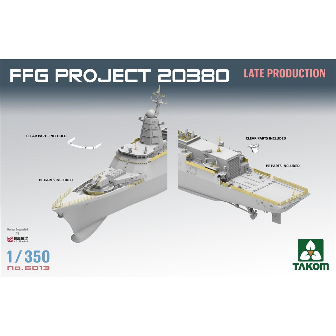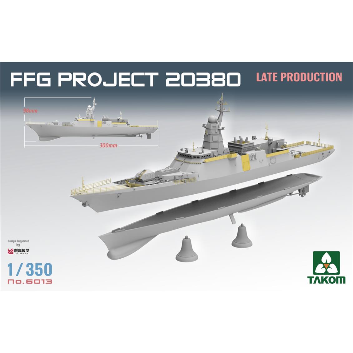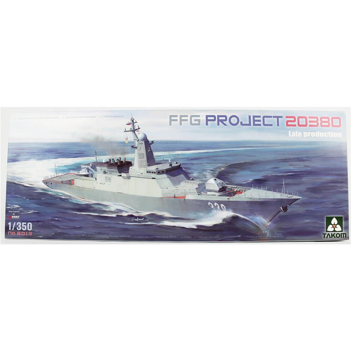 Takom 6013, 1/350 FFG -Projekt 20380 Steregushchiy -Klasse ist ein Kunststoffmodell -Kit, das die späte Version der Corvette modelliert hat. Aktualisierte Radarsysteme, Waffengeräte und Aufbauten dieser Corvette, eines der modernen Kriegsschiffe der russischen Marine, spiegeln sich im Detail wider. Dank empfindlicher Teilformen wird ein hoher Realismus erreicht. Dieses Kit ist ideal für Sammler und erfahrene Modellisten und erfordert Klebstoff und Farbe. Es ist nicht in der Box enthalten.
