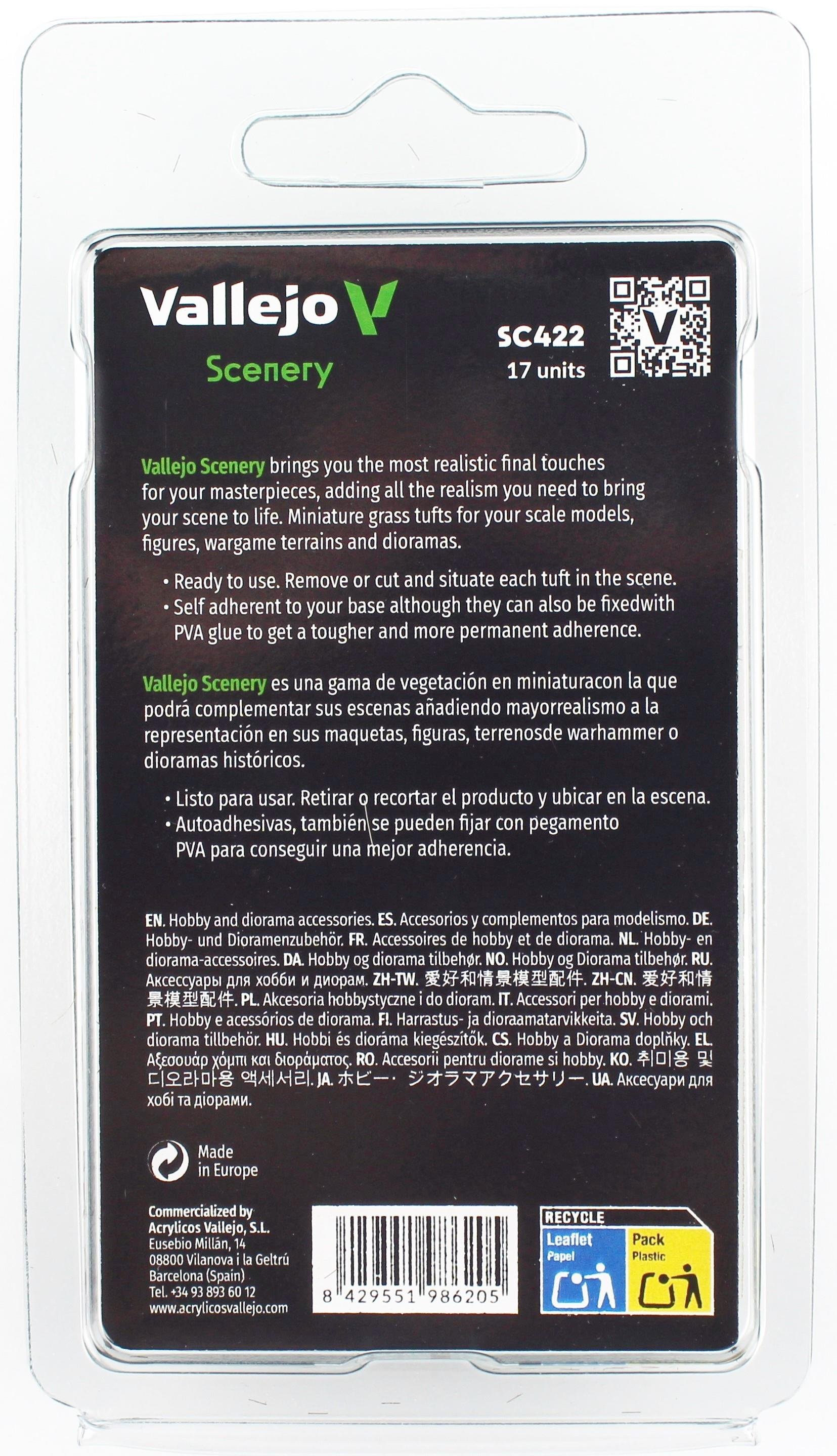 Die Vallejo -Szene ist eine Reihe von Miniaturgras, die dazu beiträgt, Ihre Szenen zu vervollständigen, und der Darstellung von skalierten Modellen, Figuren, Kriegsgebieten oder historischen Diyorama mehr Realismus verleiht.• Es ist bereit für die Verwendung, indem Sie jede Prise nacheinander schälen und in Ihre Bühne platzieren.• Es hält spontan an Ihrer Basis, kann aber auch mit PVA fixiert werdenVerwenden Sie den Kleber, um eine härtere und dauerhaftere Haftung zu erreichen.