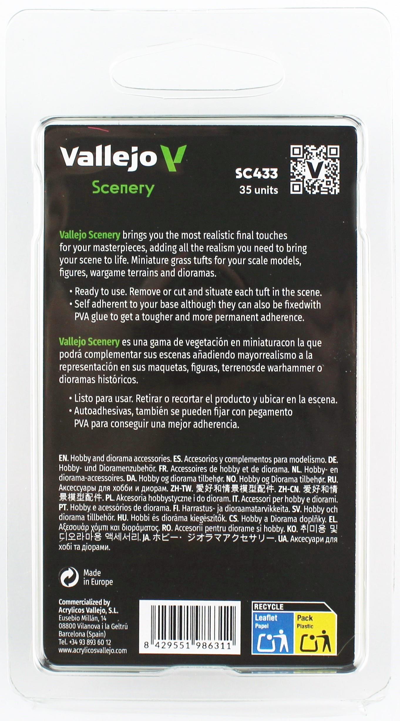Die Vallejo -Szene ist eine Reihe von Miniaturgras, die dazu beiträgt, Ihre Szenen zu vervollständigen, und der Darstellung von skalierten Modellen, Figuren, Kriegsgebieten oder historischen Diyorama mehr Realismus verleiht.• Es ist bereit für die Verwendung, indem Sie jede Prise nacheinander schälen und in Ihre Bühne platzieren.• Es hält spontan an Ihrer Basis, kann aber auch mit PVA fixiert werdenVerwenden Sie den Kleber, um eine härtere und dauerhaftere Haftung zu erreichen.