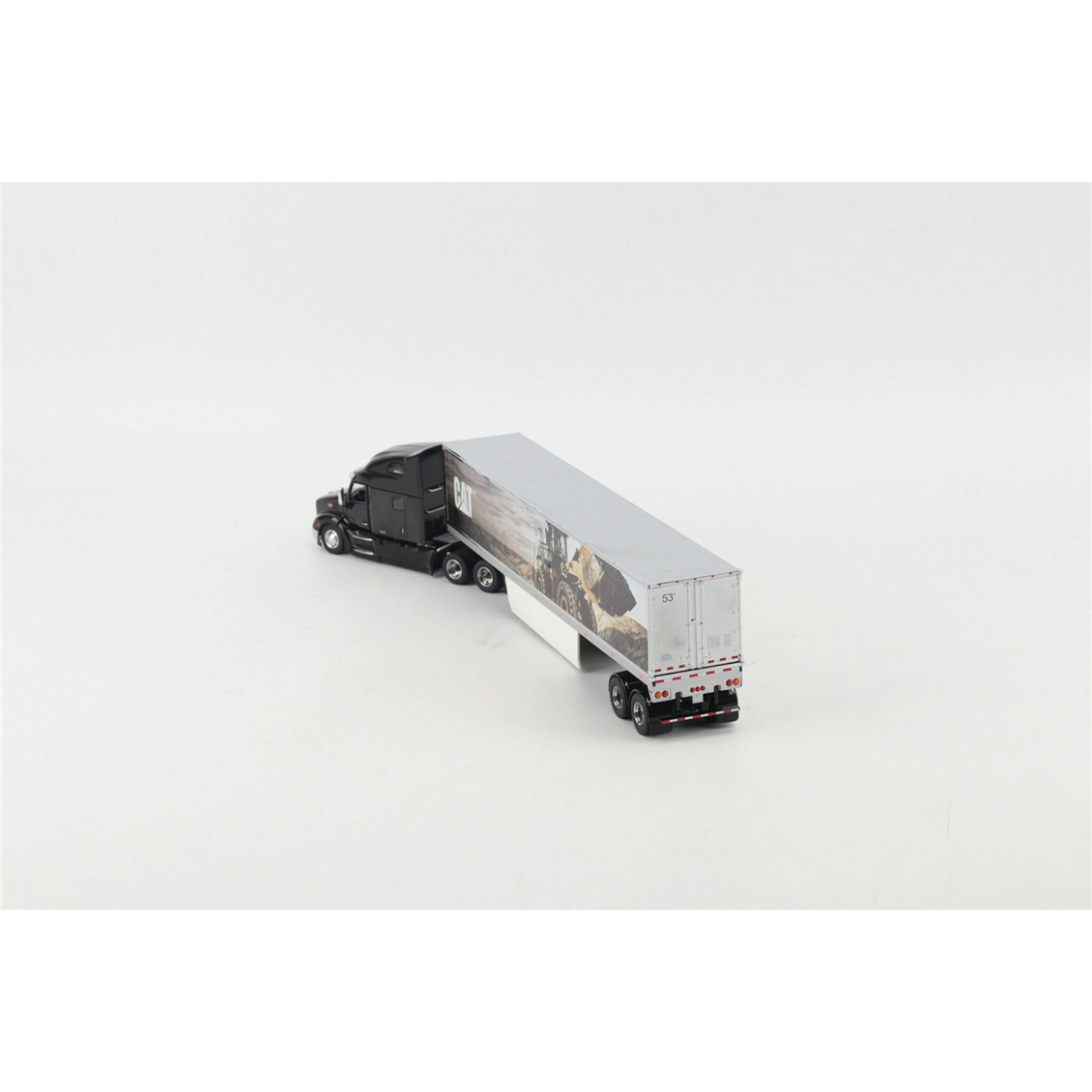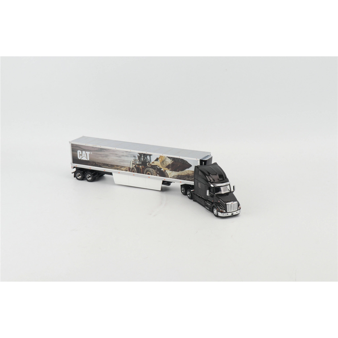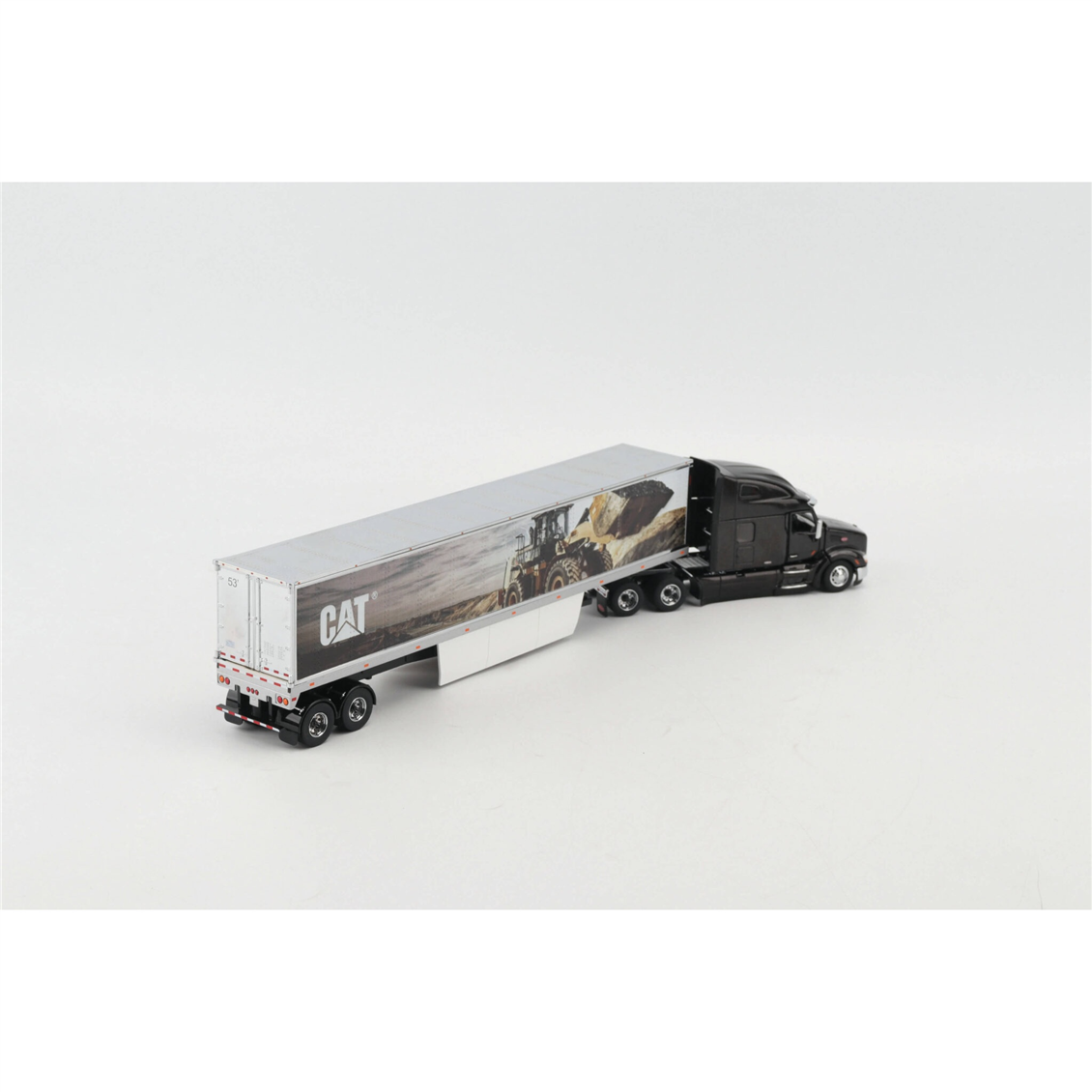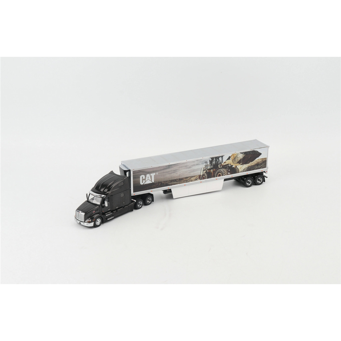 Diecast Masters'ın Transport Series koleksiyonuna ait bu 1:50 ölçekli model, modern lojistik gücü ile ikonik iş makinesi estetiğini bir araya getiriyor. Parlak siyah gövdesi ve krom detaylarıyla öne çıkan Peterbilt 579 Ultra Loft çekiciye, yan yüzeyinde devasa bir Caterpillar iş makinesi görseli bulunan özel tasarım bir dorse eşlik ediyor. Tamamı ağır metal (die-cast) dökümden üretilen bu set; açılabilir kaputu, detaylı motor aksamı ve gerçekçi kabin içi tasarımıyla hem model kamyon meraklıları hem de CAT koleksiyonerleri için vazgeçilmez bir parçadır.