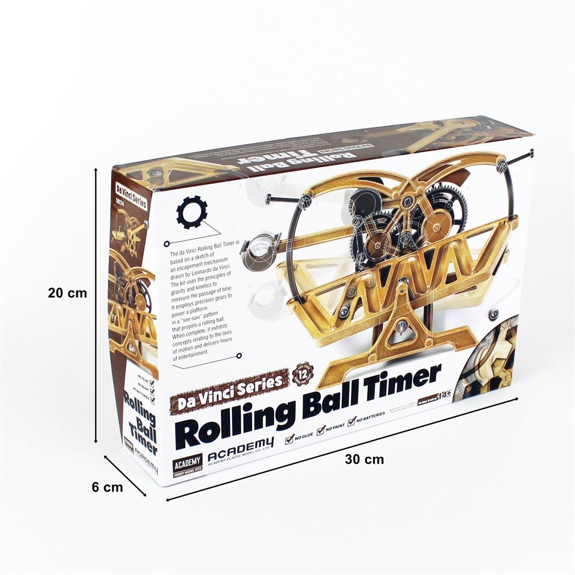 Da Vinci rolled ball timer was developed from the concepts of a mechanism escaping from Leonardo's sketch book. The Kit uses gravity and kinetic principles to measure the passage of time. It uses sensitive gears to provide power to a platform in a "seesaw" layout that pushes a rolling ball. When completed, it exhibits a concept exhibitions and entertainment for hours of movement laws.