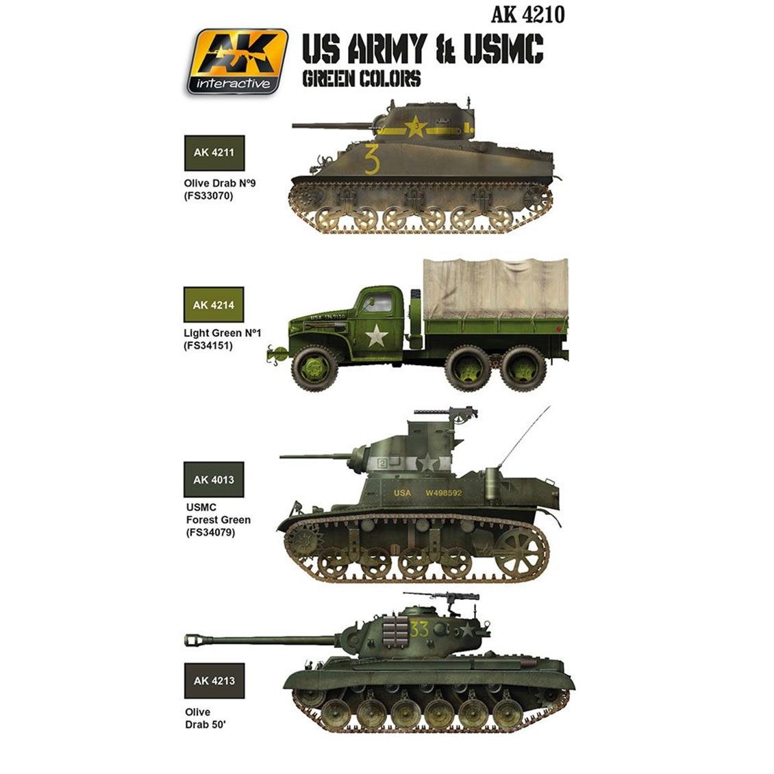 AK Interactive 4210 US ARMY and USMC Green Tones Model Painting Set 6x17 ml.