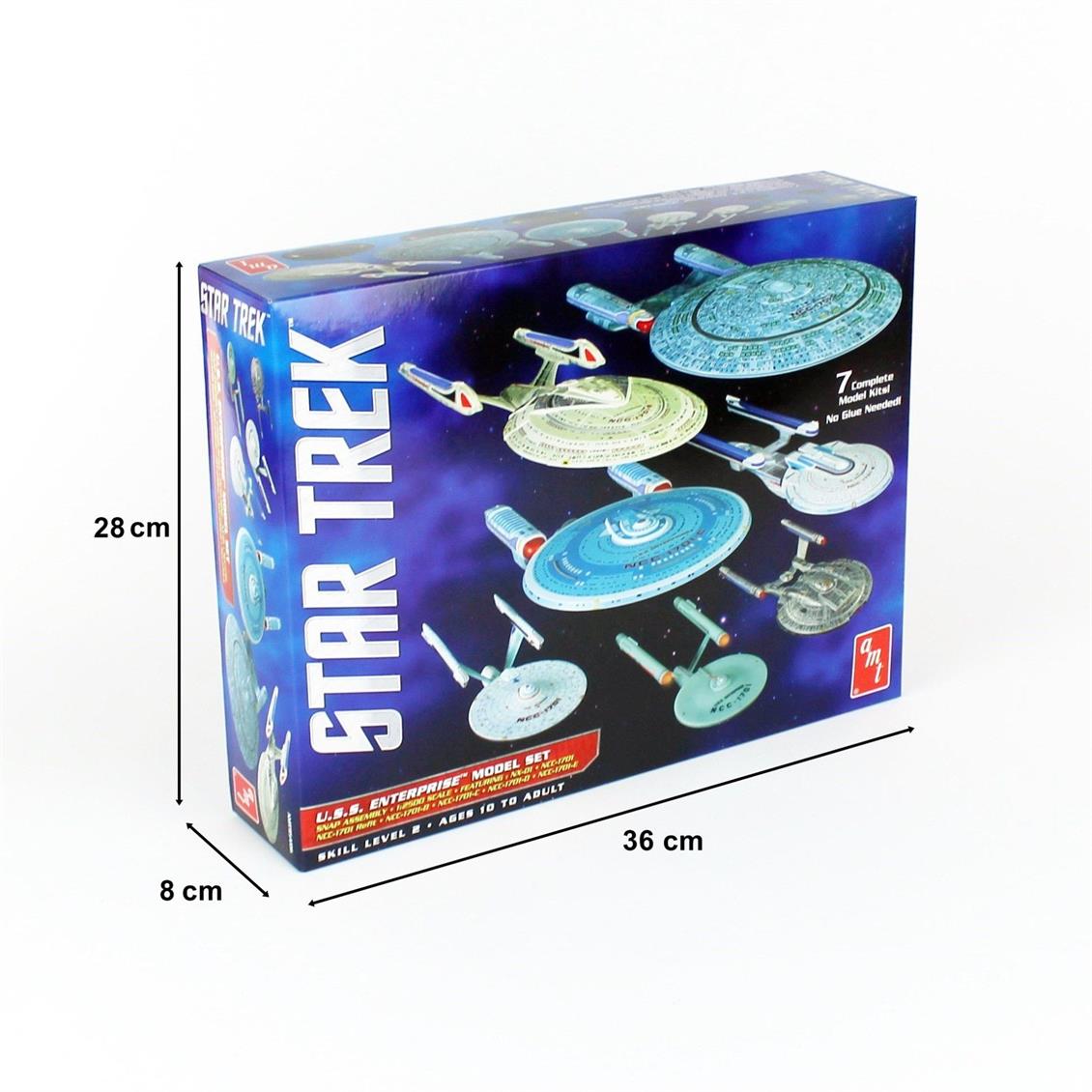 Throughout generations, Star Trek ™ introduced various versions of USS Enterprise ™. It all started with the classic NCC-1701 in the original series, and the view of the ship developed and grew in subsequent films and television programs. In total, he had seven different ships, Captain Piccard, the name of the original Enterprise under the command of the Captain Archer, Captain Kirk had a mission consciousness. This set exhibits all of the seven versions of the ship on the same 1/2500 scale, including the NX-01 Enterprise, a completely new 1: 2500 scale SEE! Each kit is injected as colored and does not require glue, so it passes. Provides pressure -sensitive stickers, complex surface details and pennants and registration letters without the need for water or detailed painting. Each ship comes with a solid base.
