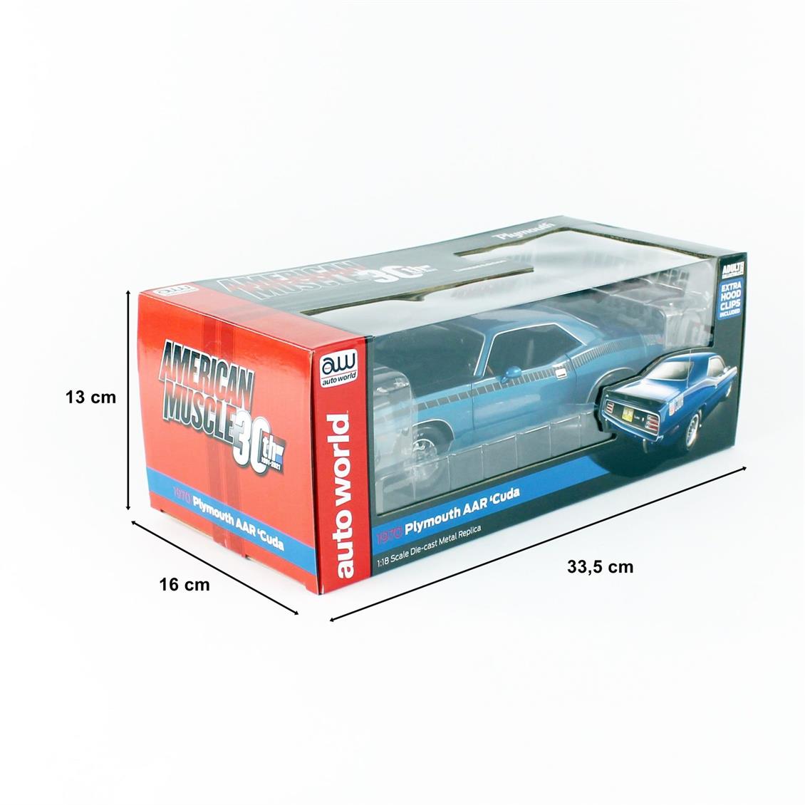 In 1970, Plymouth, who signed a contract with Dan Gurney's All American Racers (AAR), started to compete with two cars used by Dan Gurney and Swede Savage in the SCCA Trans Cunt race. Thus, 2724 pieces of 1970 Plymouth Aar were produced from Cuda. Under the hood, there were three double -barreled Holley carbohydrate V8 V8 and producing 290 HP low power at 5000 rpm. Among the upgrades were suspension, tattoo cranks and bars, larger brakes and an aluminum suction manifold. On the outer part, there was a rear deck spoiler, dimming hood process, optional shutters and a 75 -segment flash -lane AAR coat of arms extending along the length of the car. Limited numberReal rubber tiresReal -scale detailIt has a carpet -covered interiorIt has orientable wheelsOfficial licensed productExtra hood clipsHood, doors and opening of baggageMade of casting metal with some plastic piecesDetailed interior, outer, engine compartment