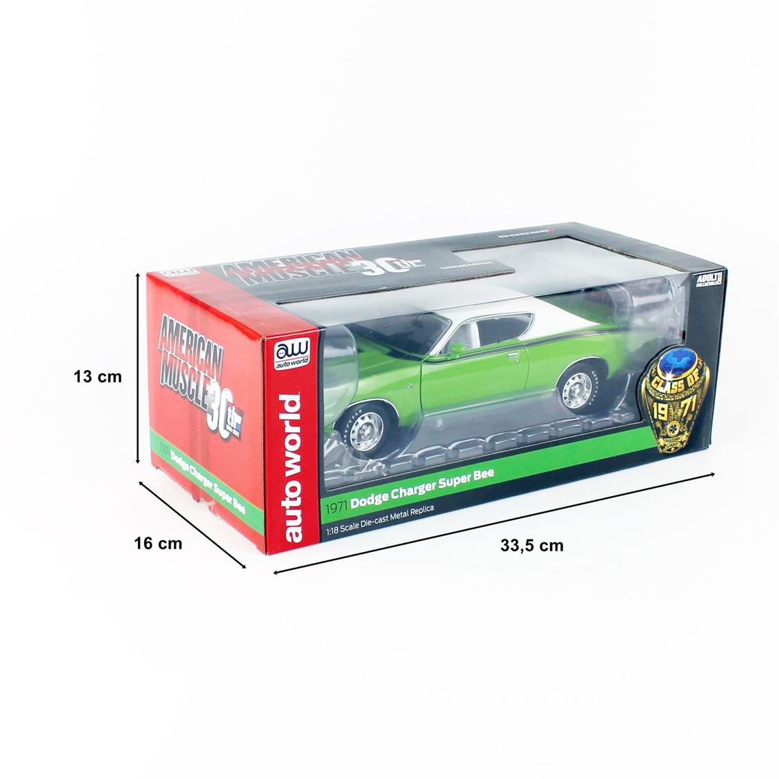 Casting collectors will love Acme's stylish muscle car! This is a 1971 Dodge Charger Super Bee, a 1/18 -scale model copy. In green color and detailed engine, directable front wheels, precise interior and chassis, opened doors, hood and luggage, 383 magnum large block V8 features. Ideal for a great car for any powerful car collection and ambitious Dodge fanatics! 1/18 scale collection model carDetailed motor, directed to the front wheelsSensitive interior and chassis, opened doors, hood and body8