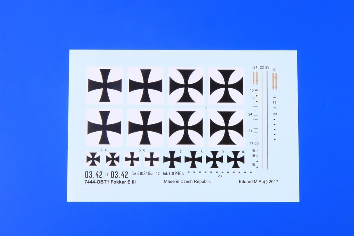 EDUARD 7444 1/72 FOKKER E III BRAND : Eduard Product Code: 7444 Scale: 1/72 History: Fokker E.III is a German hunter plane in World War I.Founded on 10 August 1916, Jagdstaffeln was equipped with these planes.E.IIIs emerged by enlarging and redesigning the wings of the E.IIs.They had a 100 hp Oberursel U.I engine with a fuel tank of 81 lits. WikipediaHighest speed: 150 km/hRange: 359 kmWeight: 399 kgMotor Type: Oberursel U.IFirst Flight Date: 1915 CONTENTS : It consists of 1 piece of plastic frame.1 decal is available.1 assembly guide is available.2 decal options are available. Plastic Model Features: