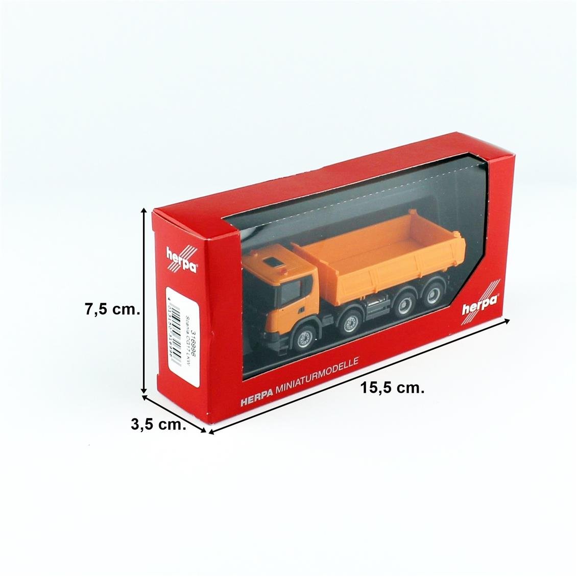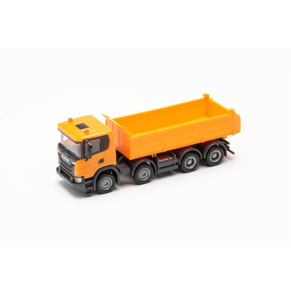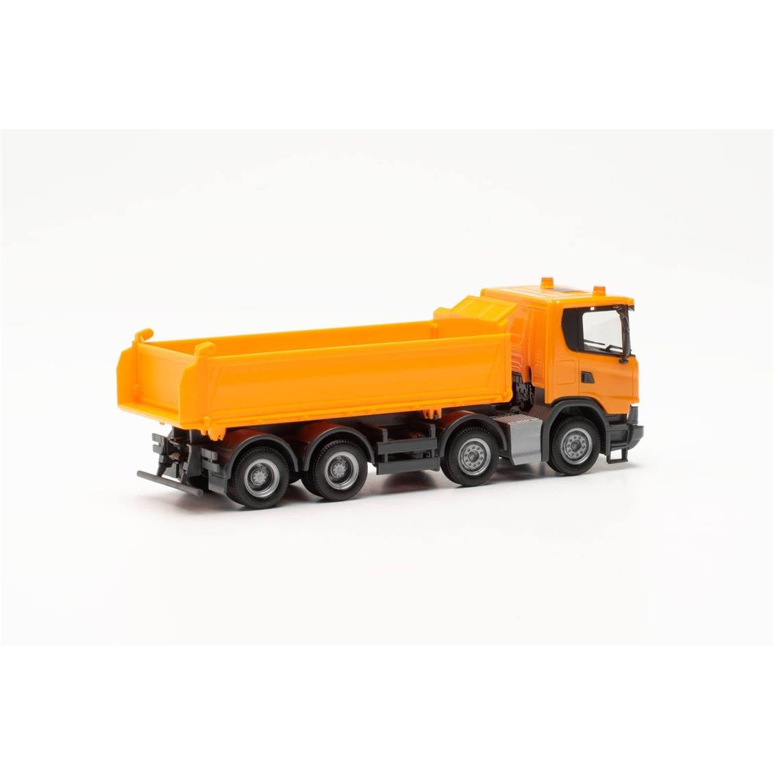 HERPA 316996 1/87 Scale, Scania XT17 Meiler Damper Truck in Three Directions, Orange, Model Vehicle Ready to Exhibit