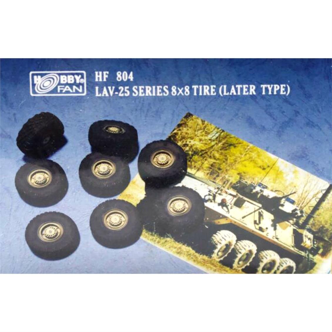Hobby Fan HF804, 1/35 scale LAV-25 Vehicle Series 8x8 Late Resin Tire Set consists of detailed and high quality resin tires for LAV-25 armored vehicles. This set is designed to realize late LAV-25 models in a realistic way. The tires are produced to reflect the details of real vehicles and will add value to model lovers' diorama and scale vehicle collections.