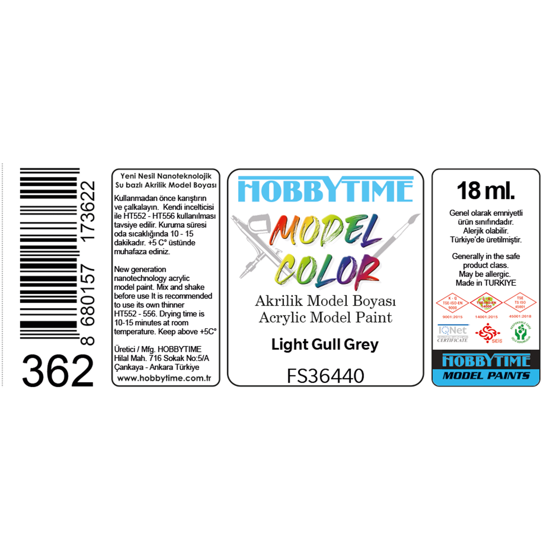 Brand:Hobbytime Model Kits Stock Code:Ht362 Measurement:18 ml. Type:Model paint Material:Acrylic