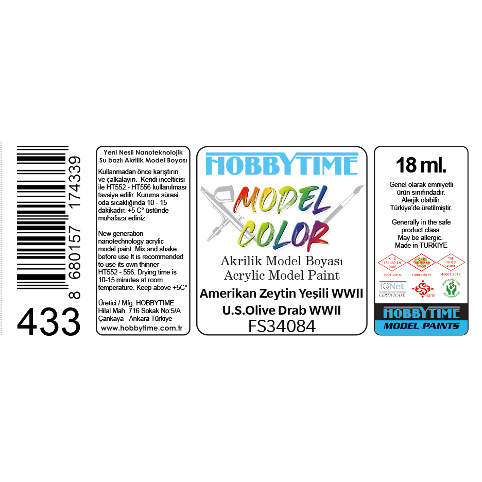 Hobbytime 433 18 ml. FS34084 18ml. American Olive Drab WWII (U.S.Olive Drab WWII), Acrylic Model Paint