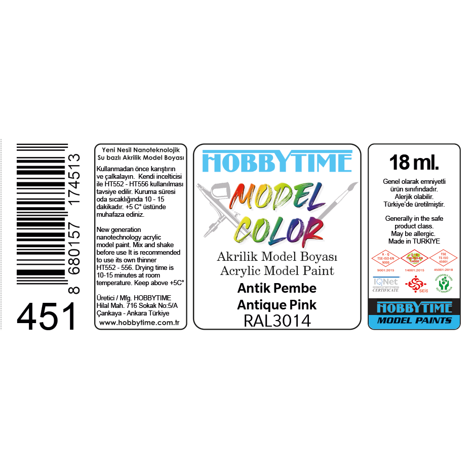 Brand:Hobbytime Model Kits Stock Code:HT451 Measurement:18 ml. Type:Model Paint Material:Acrylic