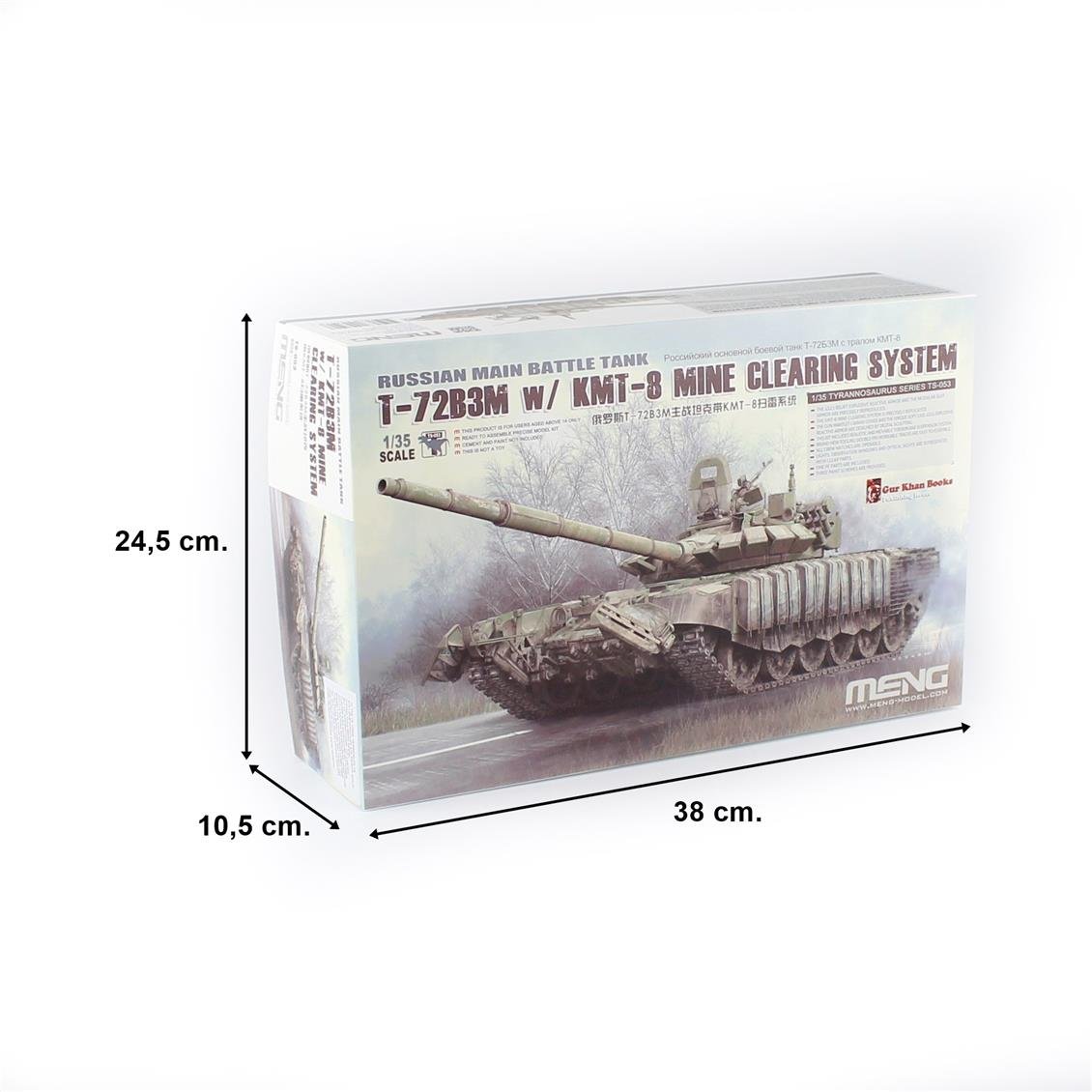 In 2014, Uralvagonzavod provided a type of tank developed to the Russian Ministry of Defense in response to the problems of the T-72B3 main battle tank. This type of tank is run with a new V-92S2F diesel engine that increases the power to 1,130 HP. It is equipped with 4S23 RLelik Explosive Reactive Armor and Blash armor to resist the attacks of light tank missiles more effectively. This variant was officially called T-72B3M and entered the service of Russian Armed Forces in 2018. In 2022, T-72B3M became the number 1 modernized tank in terms of number in Russian armed forces and was widely used. Russia's private military operation in Ukraine. Kit informationThis latest Meng TS-053 Russian main battle tank T-72B3M is a 1/35 model kit with the help of Gur Khan Books Publishing House with KMT-8 mine cleaning system. This model is a complete copy of the real tank. The 4S23 RLelikt Explosive Reactive Armor and the Leave Armor were fully reproduced. Weapon shield canvas lid and unique 4S22 soft case ERA, designed with digital sculpture. This Kit contains a realistic and active torsion rod suspension system and brand new sets, easy to assemble, double -pin operating rails. All crew caps can be opened. Lights, observation windows and optical engagement are represented by net parts. This Kit contains the KMT-8 mine cleaning system and fine PE parts. This kit provides three paint schemes.Dimensions Length: 28 cm. Width: 11.3 cm. Height: 8.7 cm