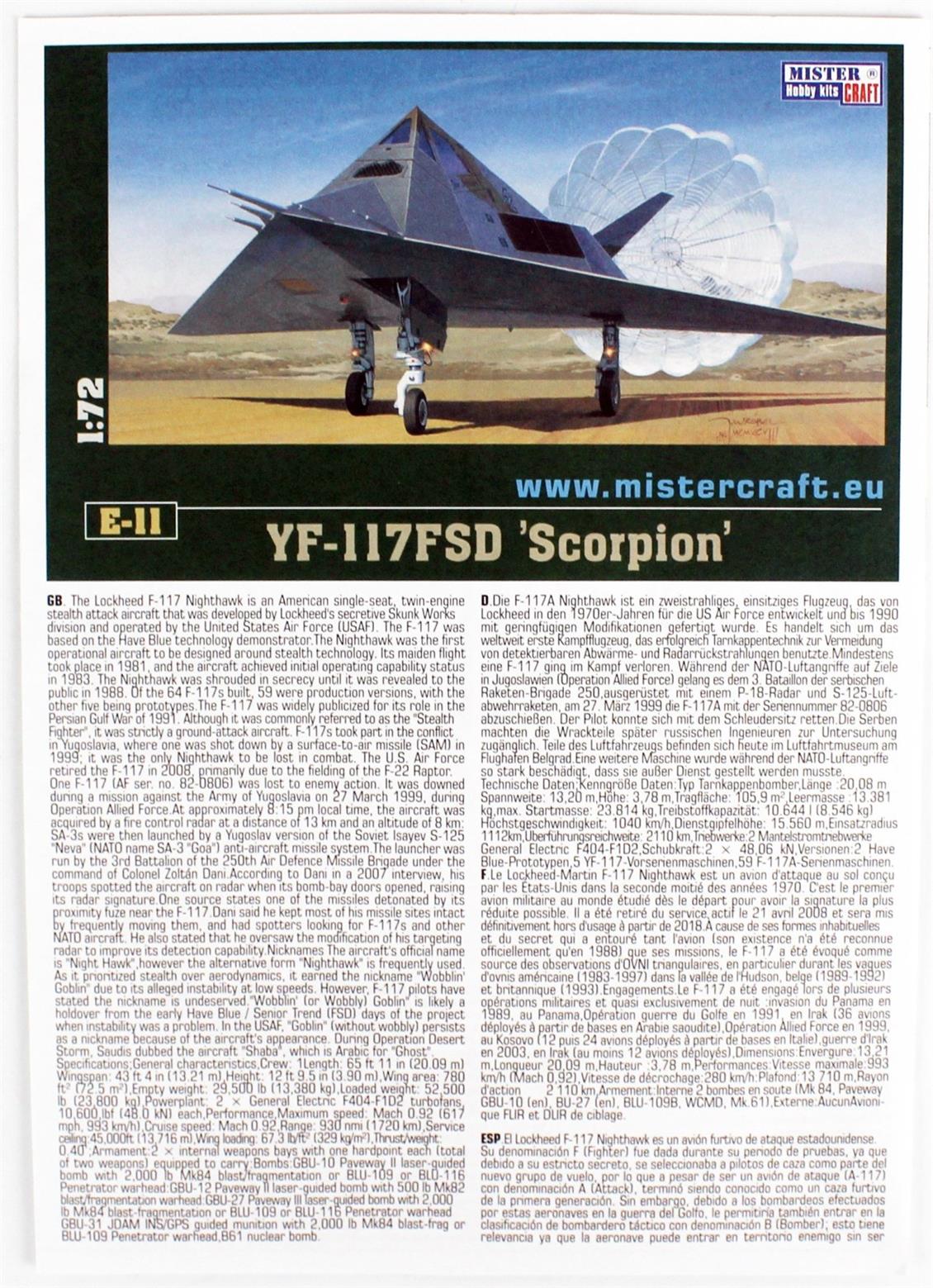 Mistercraft E011 1/72 YF-117A (Scorpion) Fighter Aircraft Disasted Plastic Model