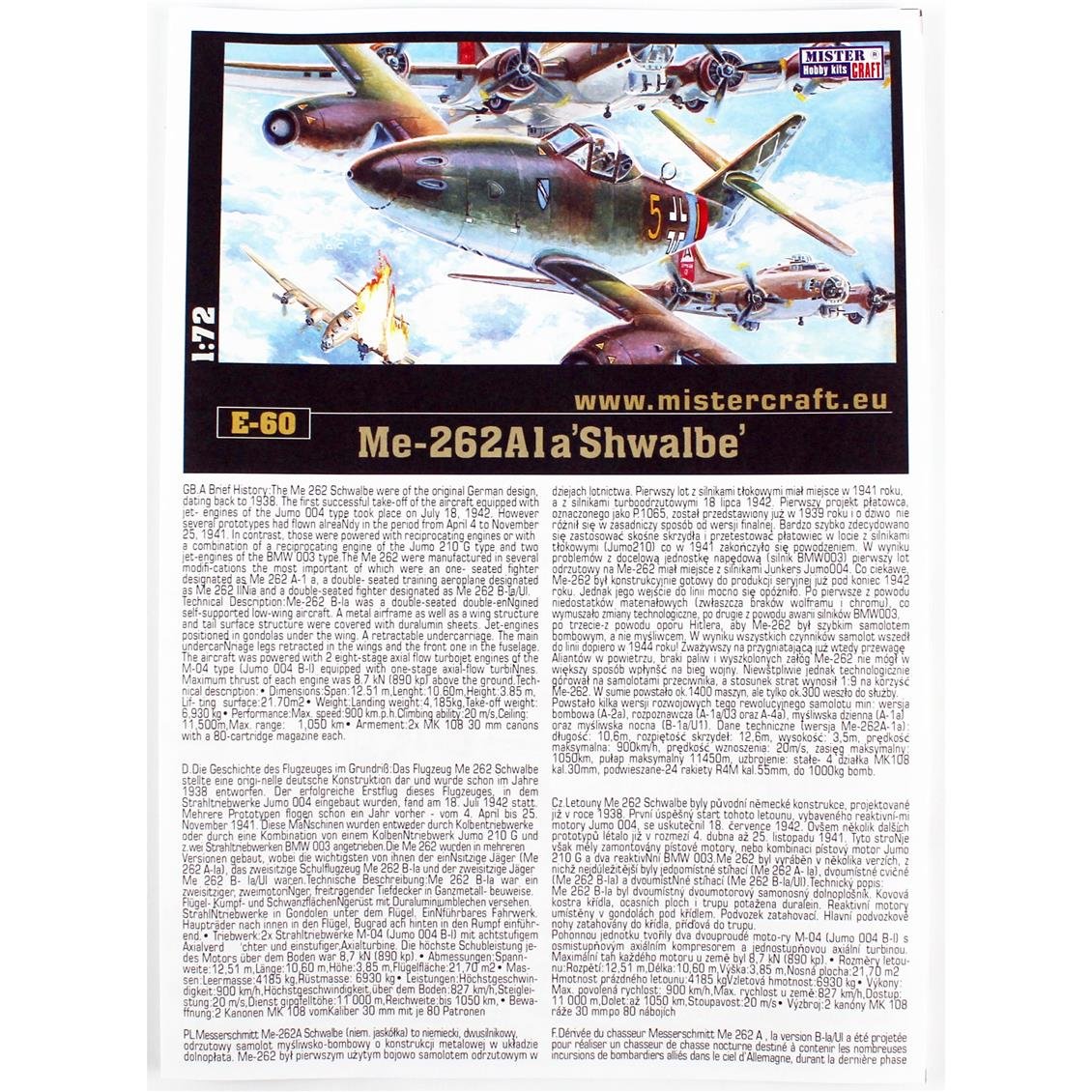 Mistercraft E060 1/72 ME-262-1A (Schwalbe) Fighter Aircraft Plastic Model Kit