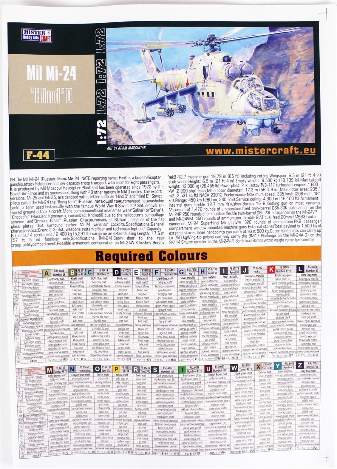 Mistercraft F044 1/72 Mile Mi-24D Hind Military Helicopter Disassembled Plastic Model
