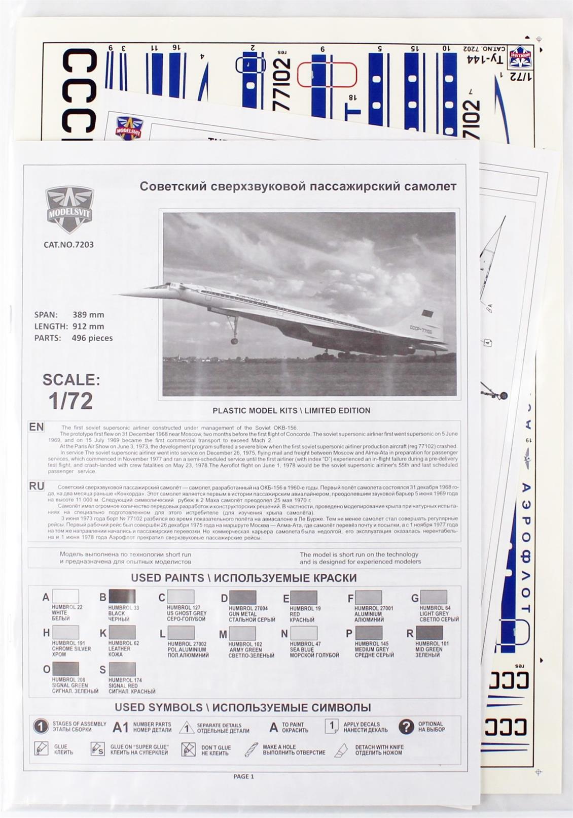 ModelSvit MSVIT7203 1/72 TUPOF TU-144 PASSENGER Aircraft Plastic Model Kit
