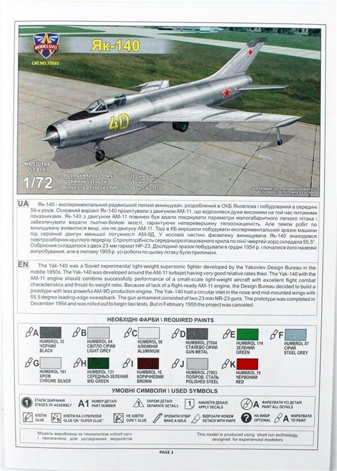 ModelSvit MSVIT72031 1/72 Yak 140 Prototype Fighter Aircraft Plastic Model Kit