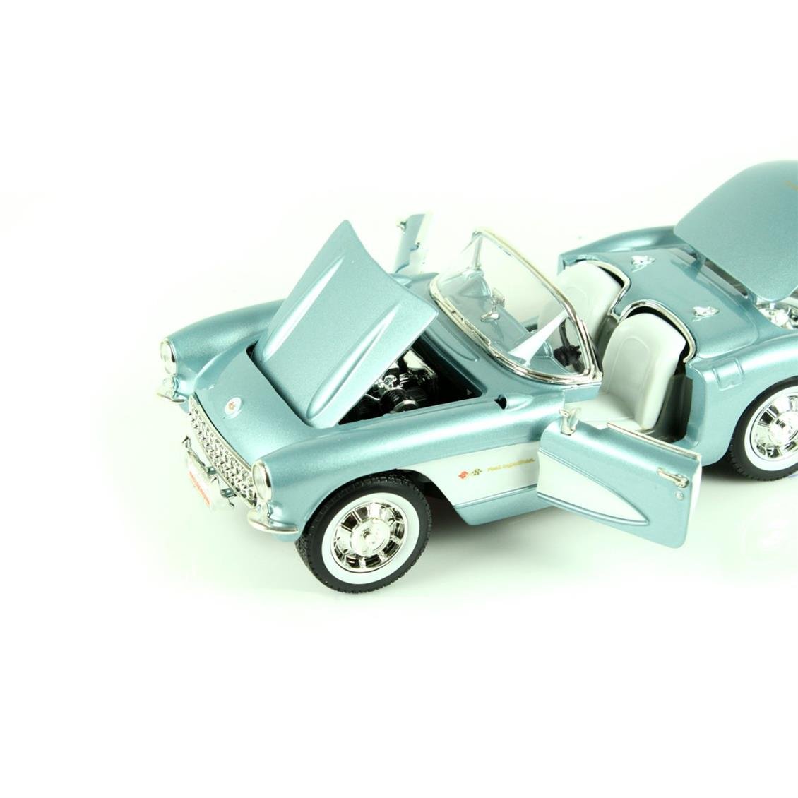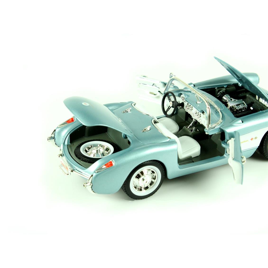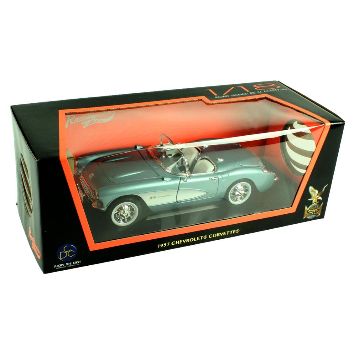 Lucky DIE CAST 92018 1/18 1957 Chevrolet Corvette model car BRAND : Luckydıecast PRODUCT Code: 92018 SCALE :1/18 COLOUR :Metallic Blue Sizes : Length : 21.5 cm.Width: 10.1 cm.Height: 8.8 cm. CONTENTS : 1 Diecast Car FEATURES : Authentic interior flooringSome detailed parts are made of casting.Detailed engine compartmentRotating of the front wheelsHood, doors can be opened. DIECAST Cars: In general With the equivalent dimensions of real size vehicles consisting of metal alloy These are detailed metal cars.Plastic varieties are available, but it is usually metal.