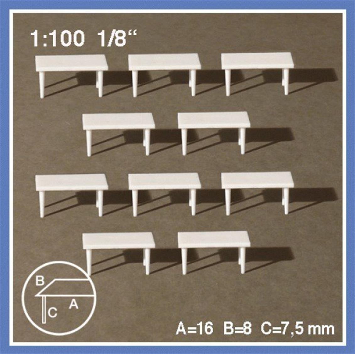 1/100 scale, 8 x 16 mm dimensions, colorless, table model. They are models that will add more detail to your projects with quality injection plastic. 10 table models appear from the packaging.