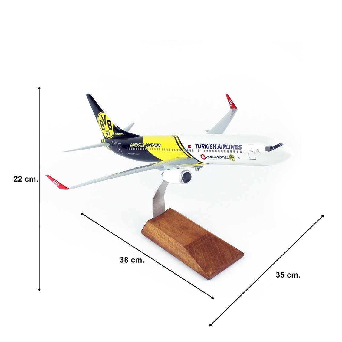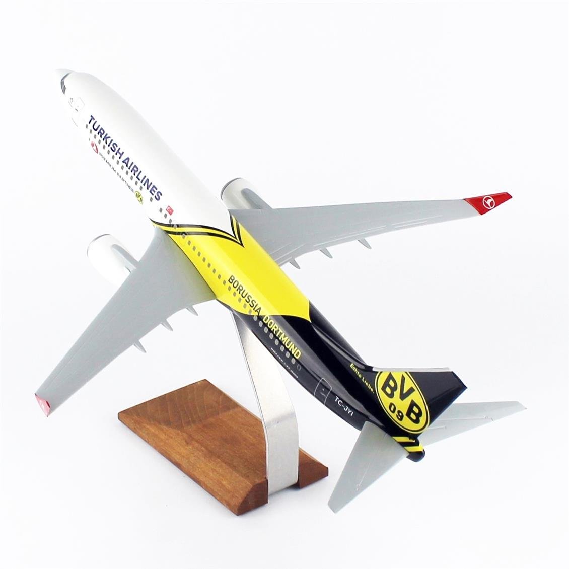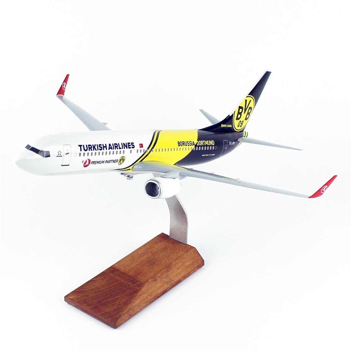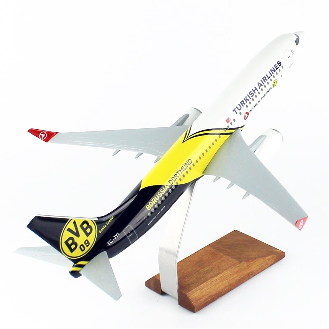 THY051 1/100 Scale, THY Borissia Dortmund Logo B737-800 Passenger aircraft, ready to exhibit wood stand with wooden stand