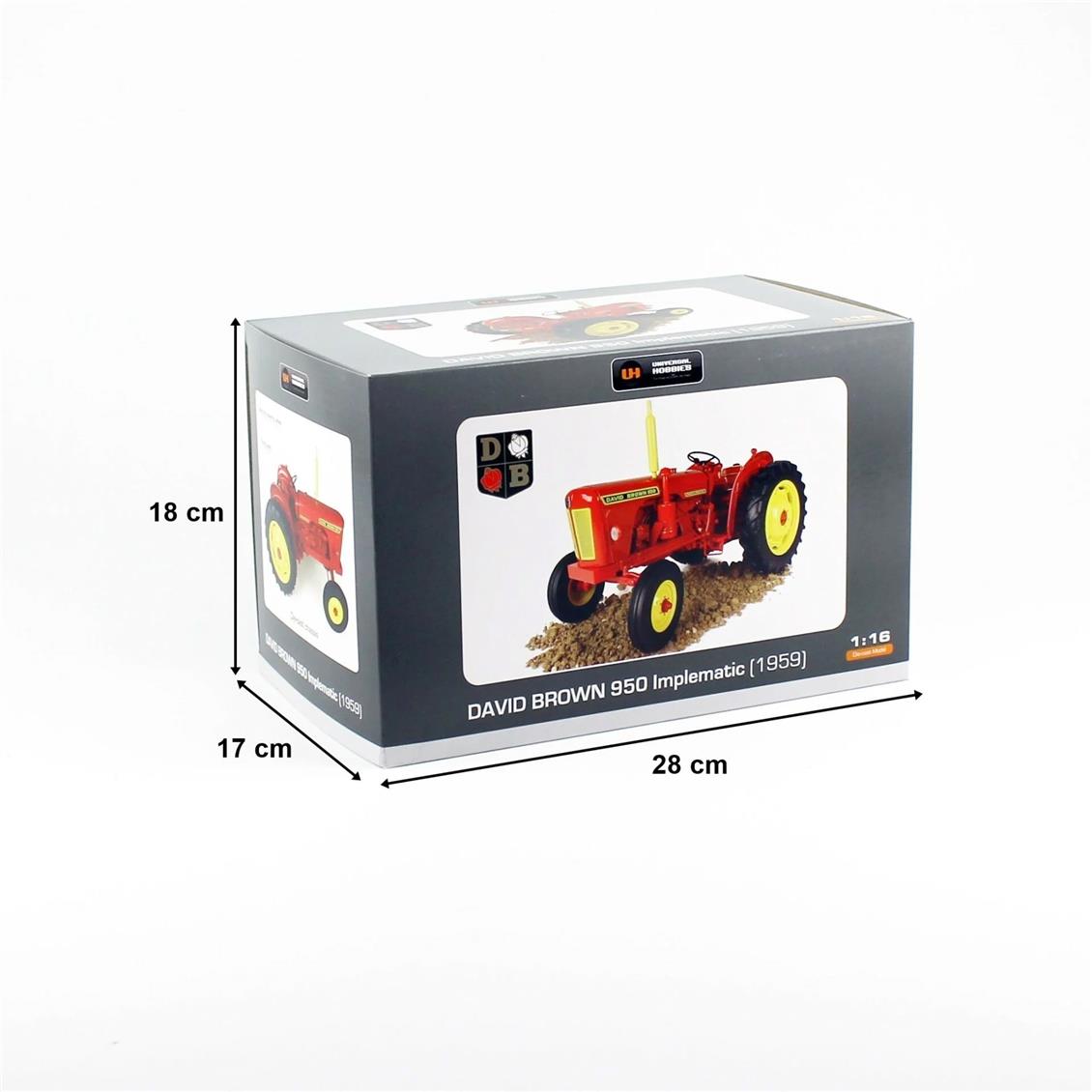This is a Universal Hobbies brand 1/16 scale David Brown 950 Implematic 1959 Tractor DieCast Replica model. Universal Hobbies is a manufacturer of many models such as agricultural vehicles, construction vehicles, trucks and cars on various scales. This model is a detailed replica of the real -life David Brown 950 Implematic 1959 tractor and is a product that a collector or tractor fan will like.