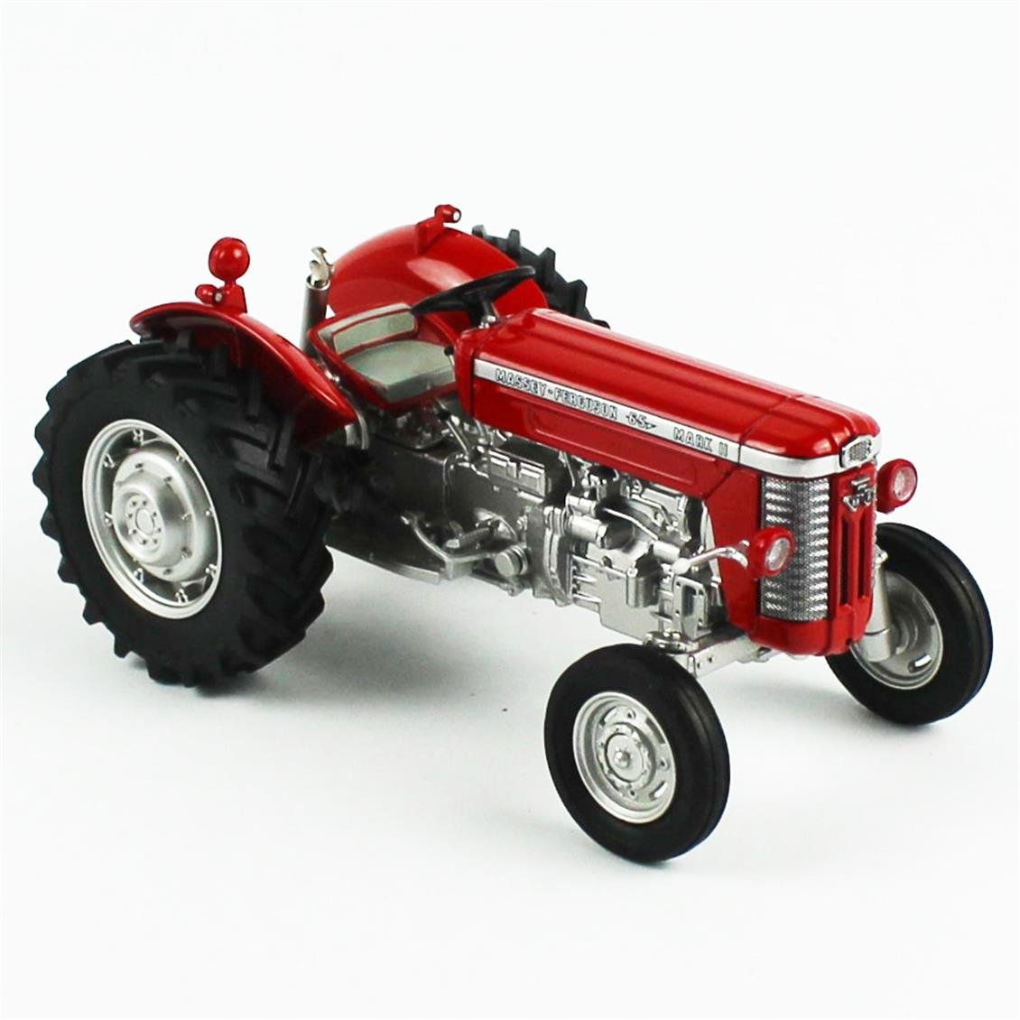 The Massey Ferguson 65 tractor consists of 69 pieces and has 106 buffer printing masks. Here, it is presented with a "Mark II" version that can be easily recognized with its special grill and exhaust pipe placed under the chassis. The wheels are functional and the tires are made of detailed engraving rubber, which is also reproduced in the same way as the reality. All parts of the engine hood and chassis are completely detailed. The seat cushion is made of soft material and the red edge appears as in the old tractor. Driving dials and signs on the hood are made by buffer printing method. The tractor has a rear connection in a operating situation and a third -adjustable third point where all kinds of 1:32 scale accessories can be connected. This 1:32 scale metal miniature is a loyal reproduction of the legendary model of Massey Ferguson. It will satisfy all the nostalgic fans of the brand!