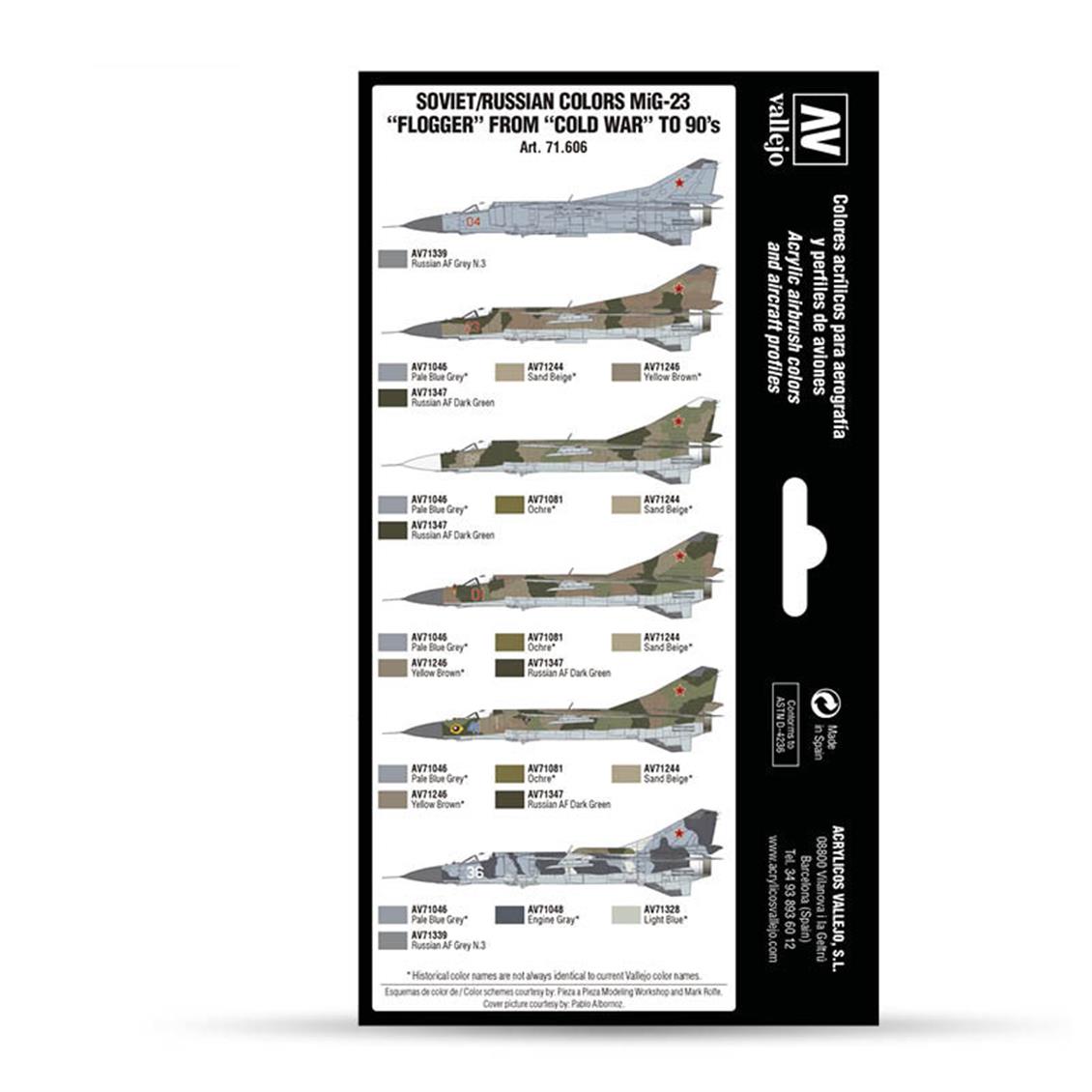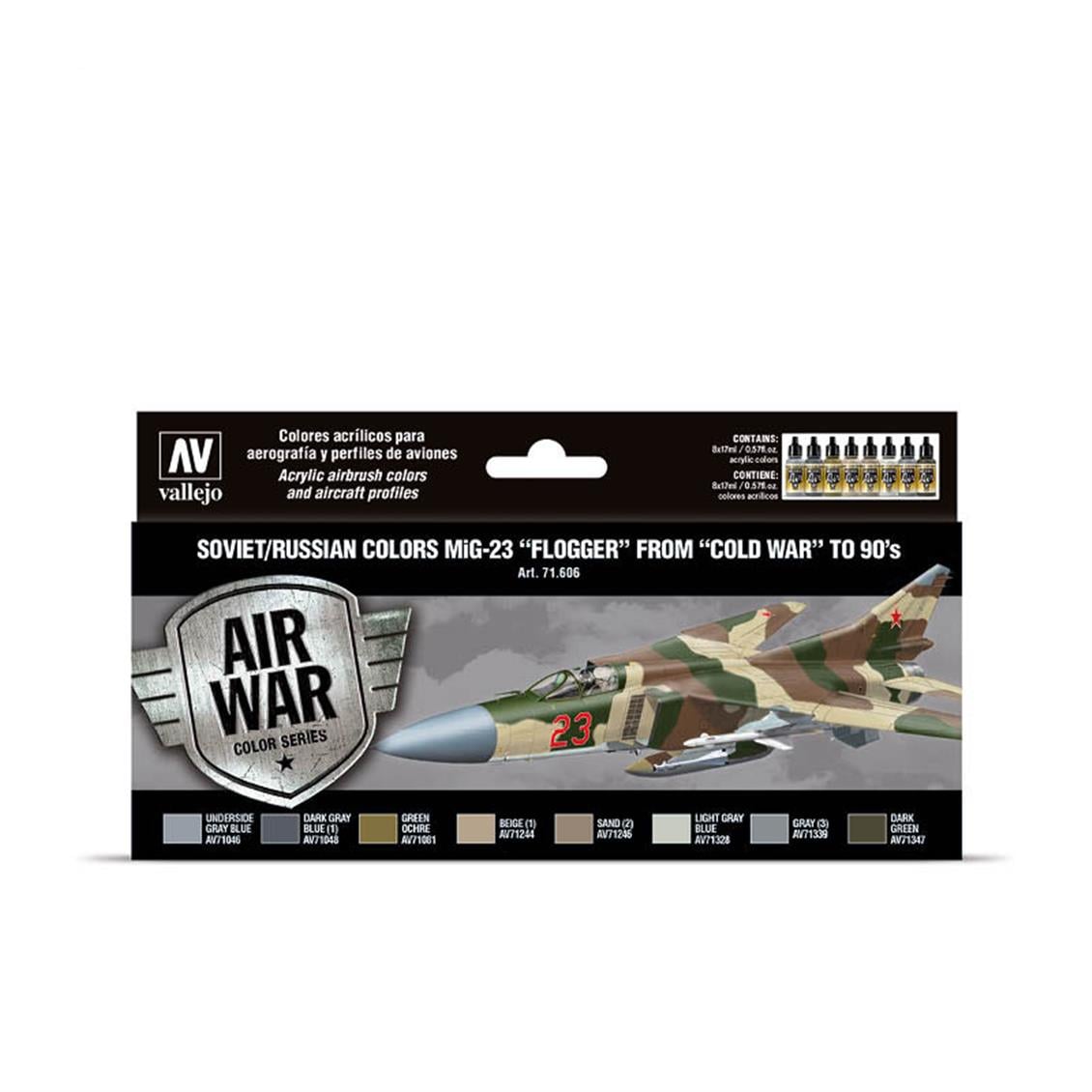 Model Air tarafından geliştirilen ve Soğuk Savaş döneminde Sovyet Hava Kuvvetleri'nde kullanılan MiG-23 "Flogger" uçaklarının farklı modellerini boyamak için tasarlanmış boya setini içerir. Set, uçakların profillerini, gerekli renklerin gösterimini ve uygulama yöntemlerinin ayrıntılı bir açıklamasını içerir. İçerik: 8 x 17 ml./0.57 fl.oz. Model Air 71.046 Açık Mavi Gri 71.048 Motor Grisi 71.081 Hardal Sarısı 71.244 Kum Beji 71.246 Sarı Kahverengi 71.328 Açık Mavi 71.339 Rus Hava Kuvvetleri Grisi N.3 71.347 Rus Hava Kuvvetleri Koyu Yeşil