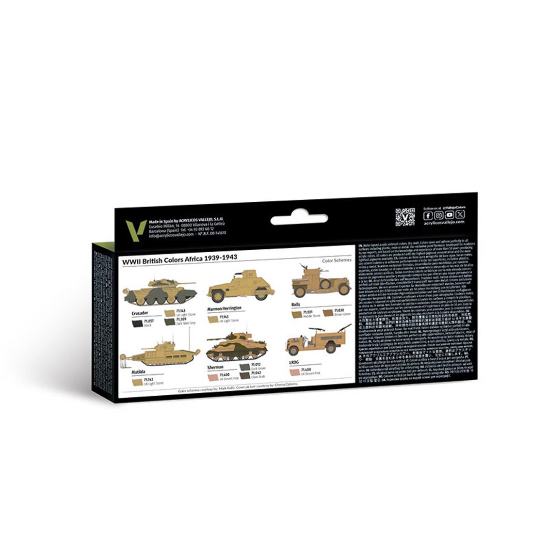 Bu set, 1939 ile 1943 yılları arasında kullanılan ve Afrika cephesinden Mısır ve Orta Doğu'ya kadar çeşitli bölgelerde görev yapan her türlü İngiliz ordusu aracının boyanması için gerekli renklerden oluşan bir seçki içermektedir. Bu setin renklerini belirlemek için uzman Mike Starmer'dan yardım aldık. İçerik: 8 x 18 ml/0,6 fl oz Model Air 71.400 İngiltere Çöl Pembesi 71.143 İngiltere Açık Taş 71.031 Orta Taş 71.030 Kahverengi Yeşil 71.309 Koyu Kayrak Grisi 71.012 Koyu Yeşil 71.043 ABD Zeytin Yeşili 71.057 Siyah