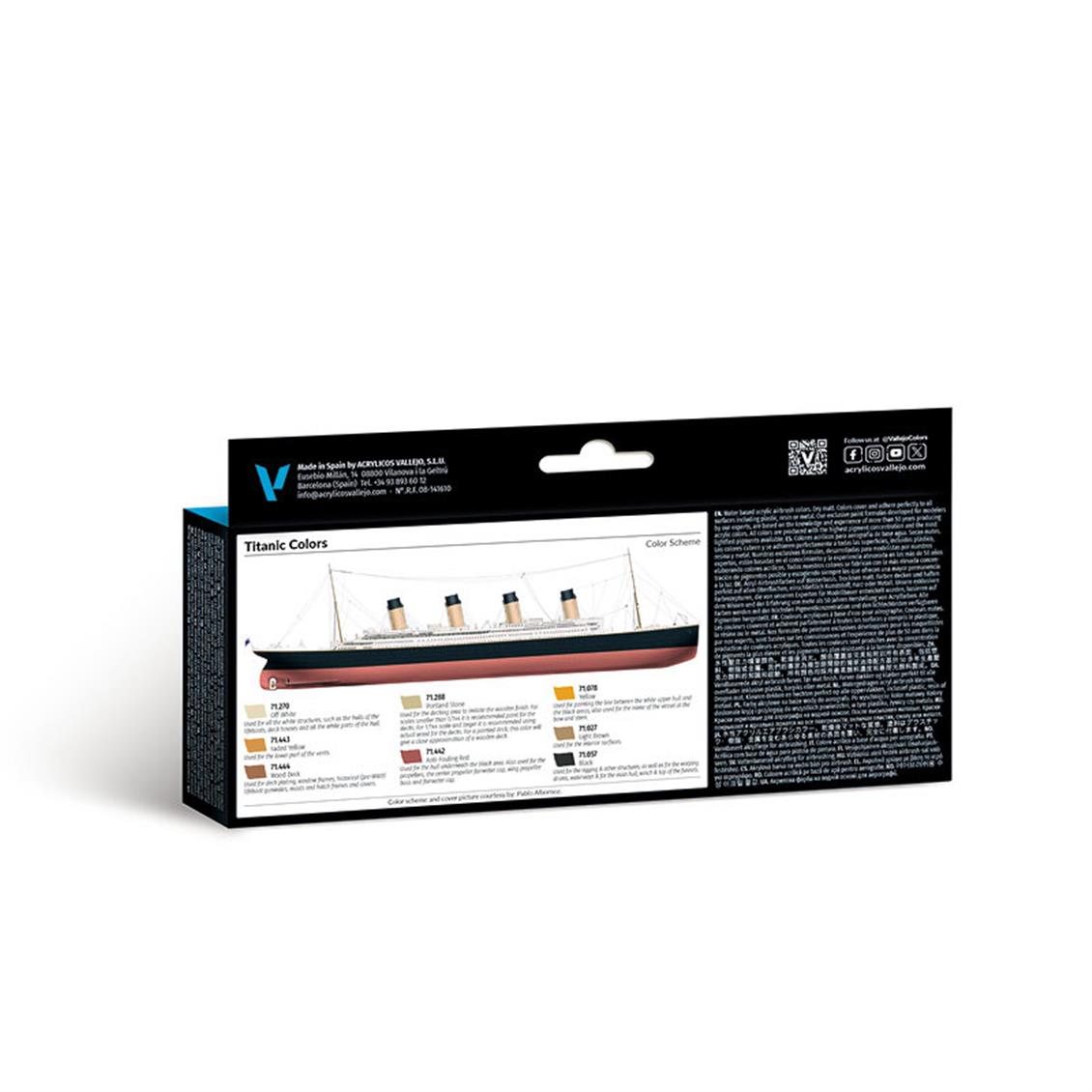 Bu set, Model Air serisinden 17 ml'lik şişelerde 8 farklı renk seçeneği sunmaktadır. Titanik maketinin boyanması için uygun olan bu renkler, en son araştırmalara ve tarihi kaynaklara dayanarak en uygun ve doğru tonları sunmaktadır. Örneğin, gövde altındaki draft rengi, genellikle koyu kırmızı bir ton olarak gösterilmiş olup, tarihi örneklere ve dönemin kayıtlarına göre, Queen Mary ve diğer Olympic sınıfı gemilerde kullanılan koyu somon rengine benzer bir tondadır. Verilen referanslar, modelcinin güverteyi ve parçalarını ahşap olarak, üst gövdeyi, onu su çekiminden ayıran sarı çizgiyi, zehirli boyayı, bacaları ve karakteristik tonlarını, cankurtaran botlarını doğru iç tonla ve onları örten brandaları boyamasına olanak tanır. İçerik: 8 x 18 ml/0,6 fl oz Model Air 71.270 Kırık Beyaz 71.288 İngiltere BSC 64 Portland Taşı 71.078 Sarı RLM04 71.443 Soluk Sarı 71.442 Zehirlenmeyi Önleyici Kırmızı 71.027 Açık Kahverengi 71.444 Ahşap Güverte 70.057 Siyah